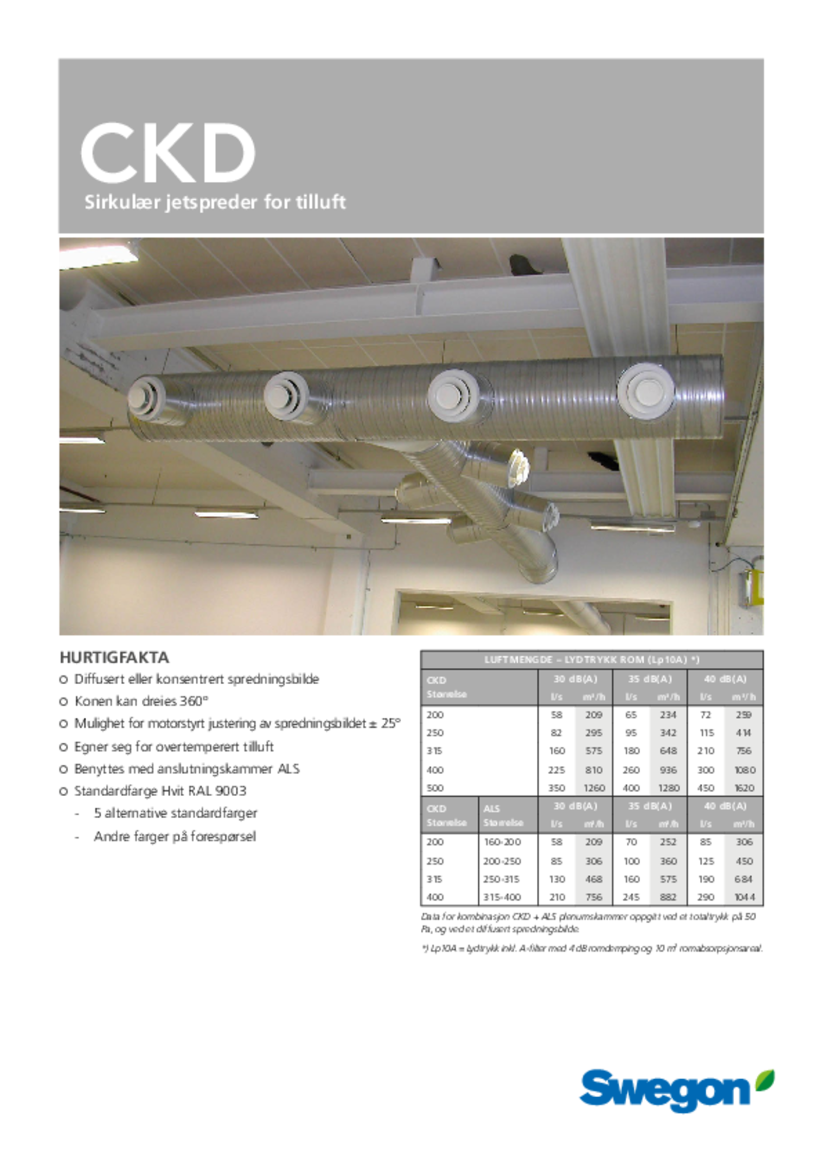 CKD er en sirkulær flerkonet jetspreder for vegg- eller takmontering. Den tåler ekstremt store luftmengder ved lavt lydnivå. Passer til konstant eller variabel luftmengde. Kan brukes til under- eller overtemperert tilluft og både horisontalt og vertikalt spredningsbilde er mulig. Passer til både komfort- og industrianlegg.