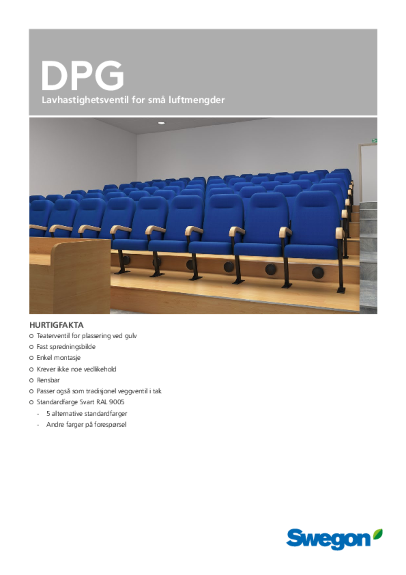 DPG er en sirkulær lavhastighetsventil beregnet på små luftmengder. Luft føres inn i lokalet med lav hastighet. Passer til lokaler der mange små ventiler kan plasseres på ulike steder for best mulig tilluftsfordeling, for eksempel i forsamlingssaler, teater, kinoer og forelesningssaler. Ventilene monteres under setene i opptrinnet. Rommet under gulvet fungerer som trykkammer. Ventilene kan også med fordel brukes som tradisjonelle veggventiler.