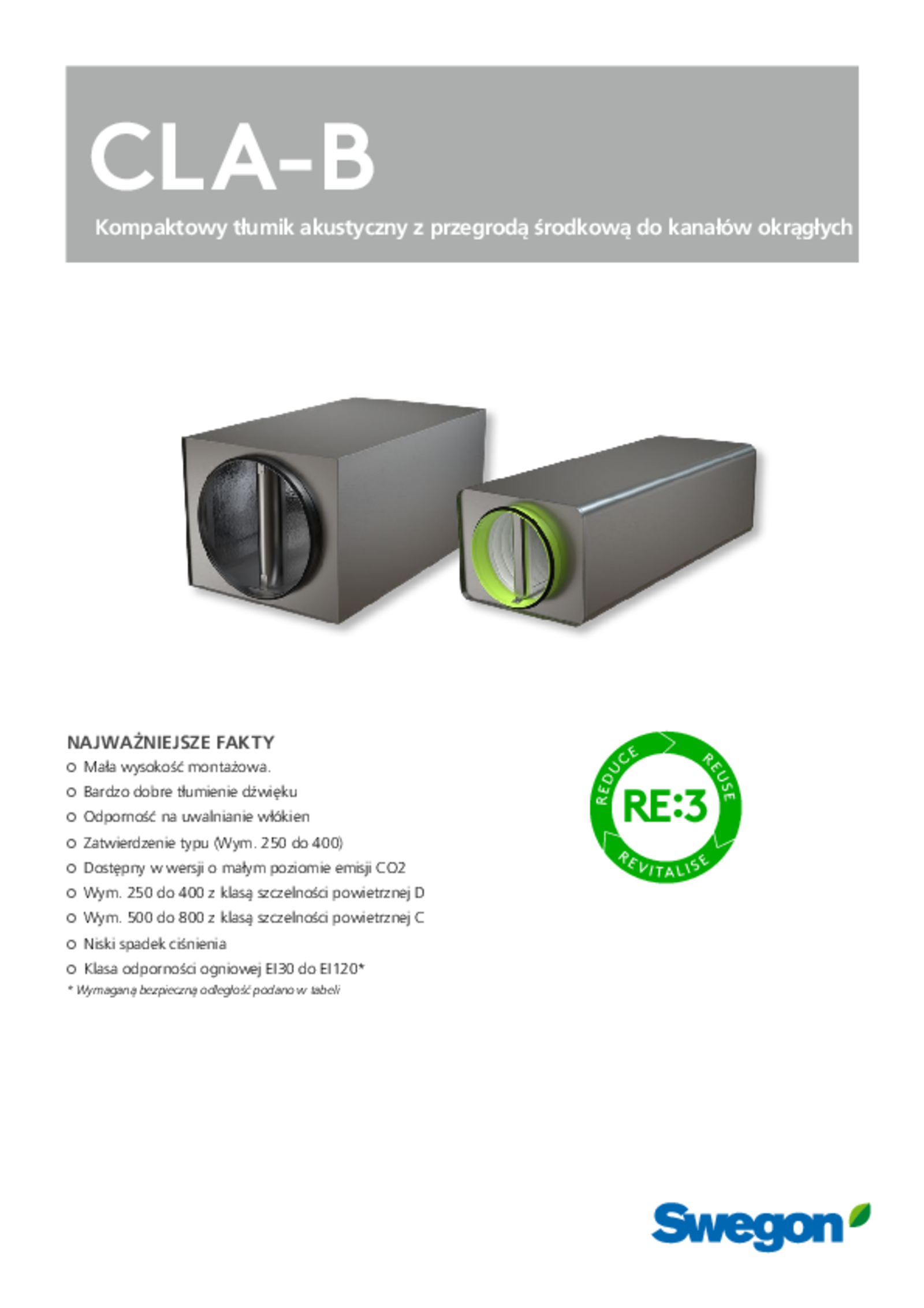 Produkty CLA-B stanowią element koncepcji RE:3 firmy Swegon, opartej na kluczowych zasadach gospodarki obiegu zamkniętego, na którą składają się RE:duce, RE:use i RE:vitalise. Modele CLA-B są wykonane z wytwarzanej w sposób zrównoważony blachy o nazwie RRP, co oznacza „recycled and renewably produced” (pochodzące z recyklingu i wytwarzane ze źródeł odnawialnych). Zawartość stali pochodzącej z recyklingu wynosi co najmniej 75 procent. Co więcej, w procesie produkcji stosuje się piece łukowe wykorzystujące wyłącznie energię ze źródeł odnawialnych.