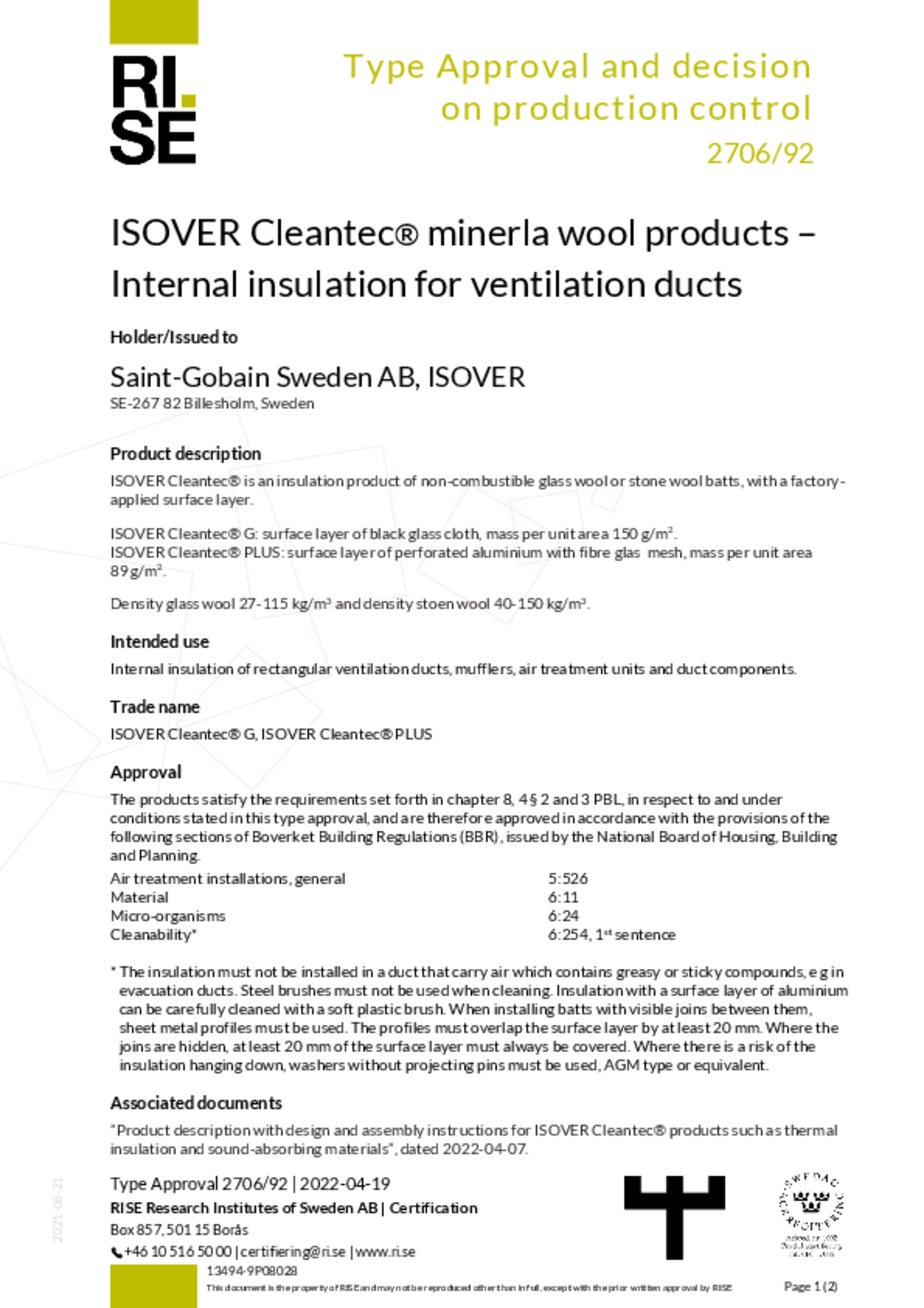 • Environmentally friendly acoustic material, approved by independent test institute: ISOVER Cleantec® PLUS