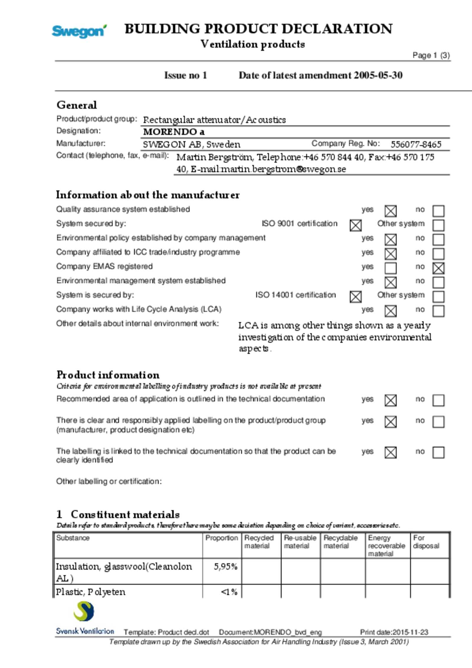 | Building product declaration (pdf 88.43kB) | MORENDO | Quality | |