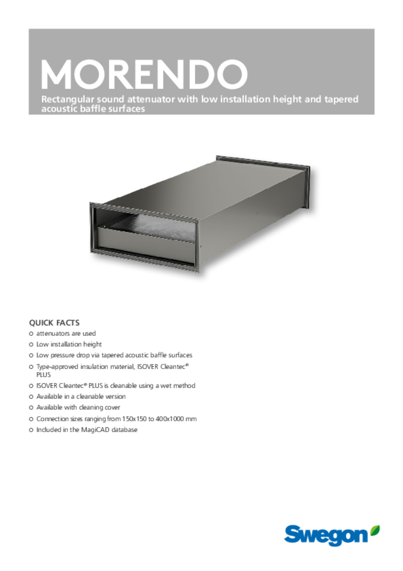 MORENDO is a rectangular sound attenuator with extra low installation height for use in installations where space is limited