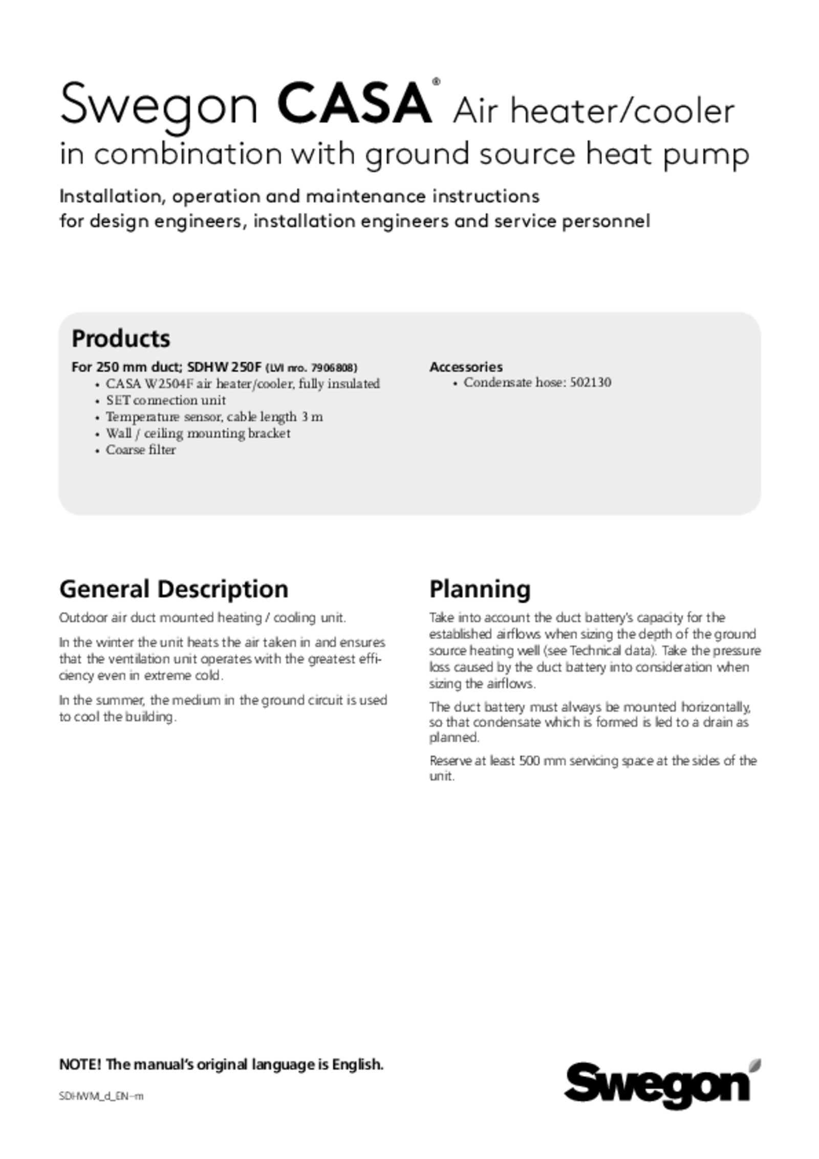 An air heater/cooler can be installed in the outdoor air duct in a property fitted with a ground source heat pump. It then utilises the heating/ cooling medium to heat the inflowing air during the winter and to cool it during the summer. In the winter the air heater/cooler heats the air taken in and ensures that the ventilation unit operates with the greatest efficiency even in extreme cold. In the summer, the medium in the ground circuit is used to cool the building. With CASA control the heating/cooling is utilised optimally all year round.