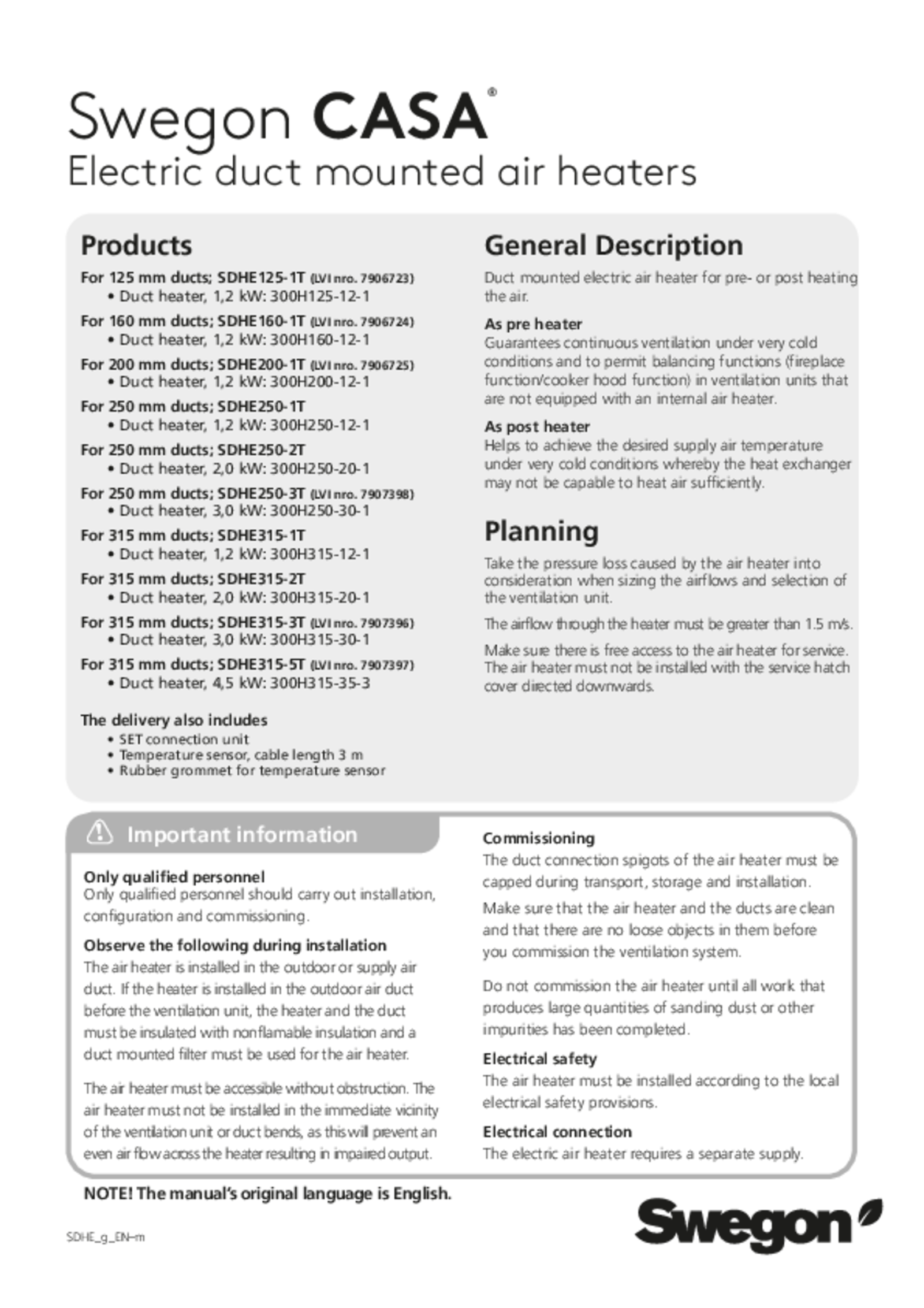 USED FOR PRE-HEATING Guarantees continuous ventilation during very cold conditions and permits balancing functions (fireplace function/function for cooker hood) in air handling units without a built-in air heater for pre-heating. An FLK-filter must be installed in the duct in front of the preheater.
