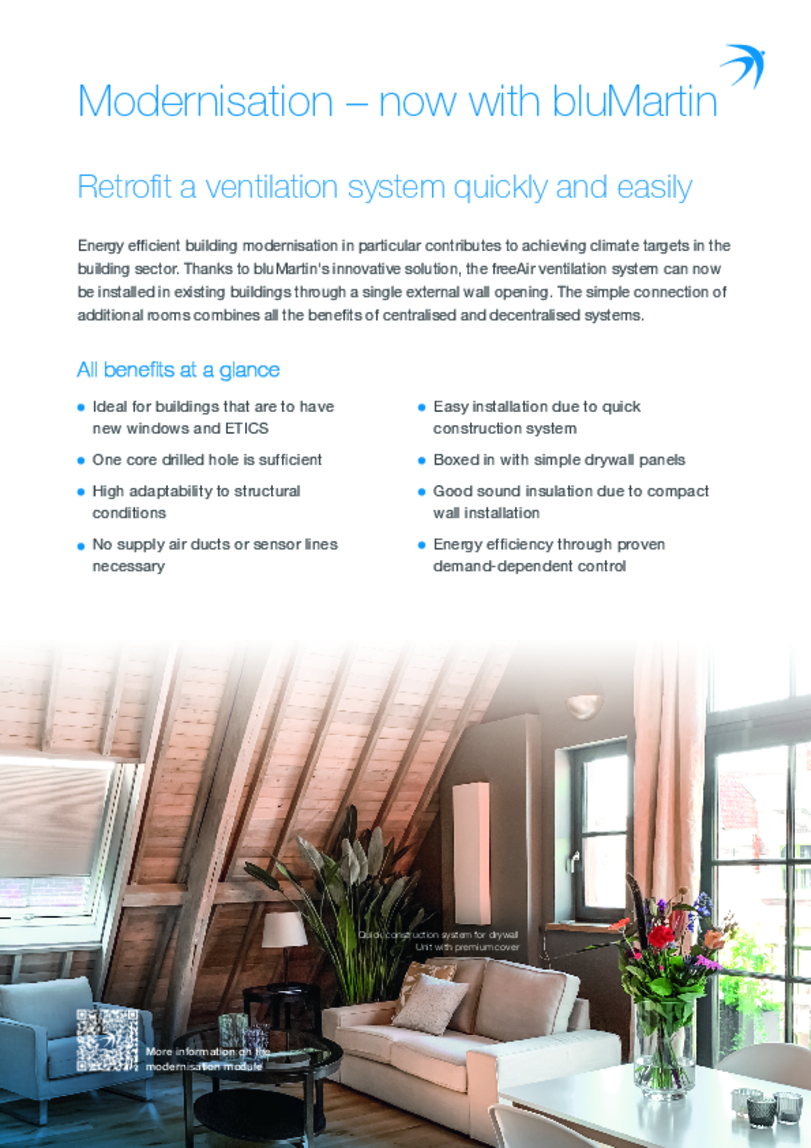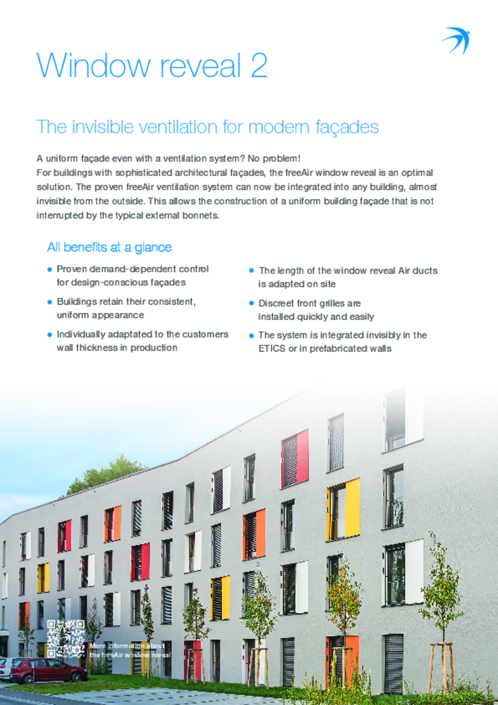 - Quick installation directly in the wall of the room/premises to be ventilated, no duct routing required