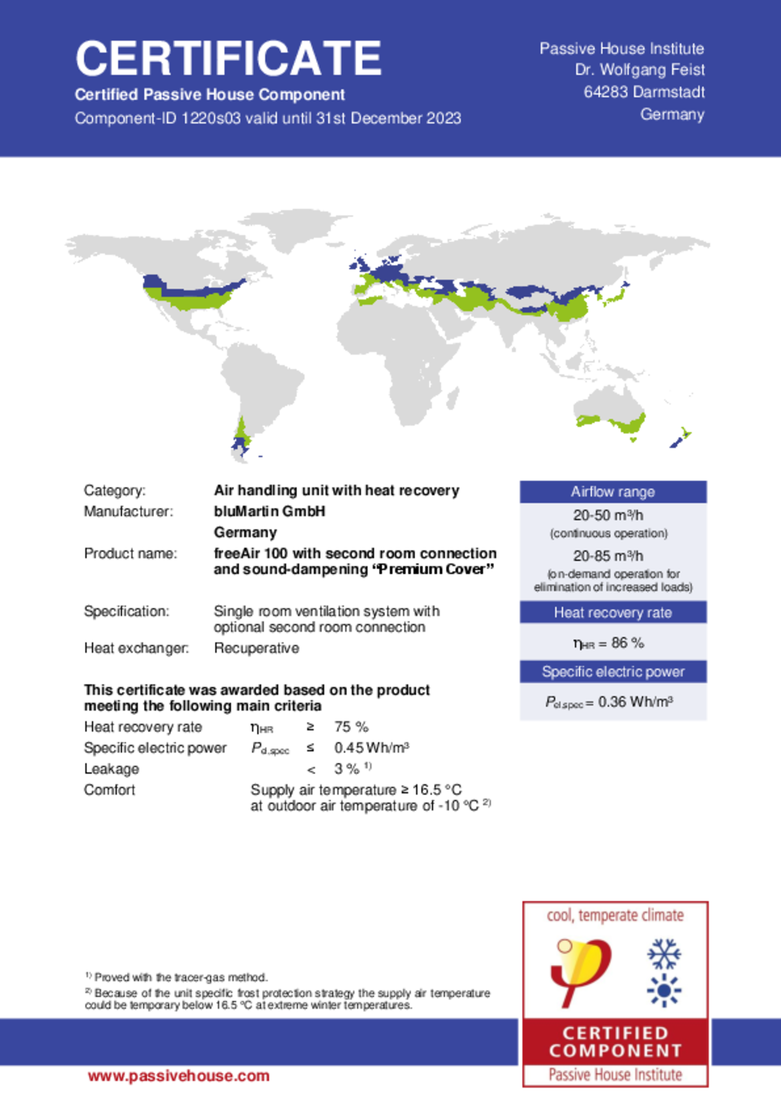 - The heat exchanger’s temperature efficiency: 86 % according to EN 13141-8 and EN 13141-7