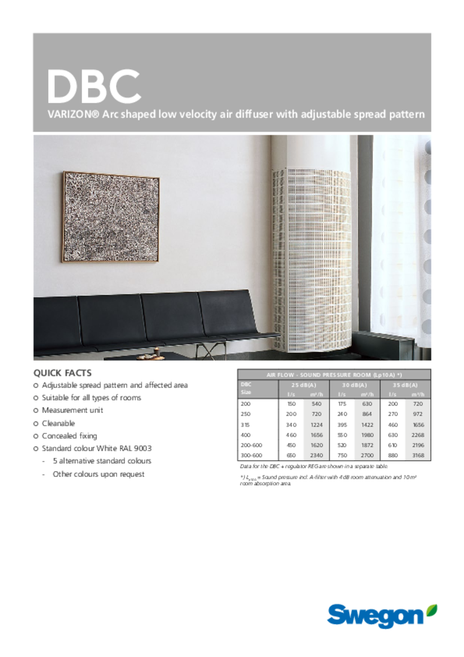 DBC is a complete, rectangular, bow-shaped displacement unit. It provides supply air at low velocity to the occupied zone. The distribution pattern is easily adjustable due to the movable nozzles. Accessories include a floor plinth, duct cover and a controller.