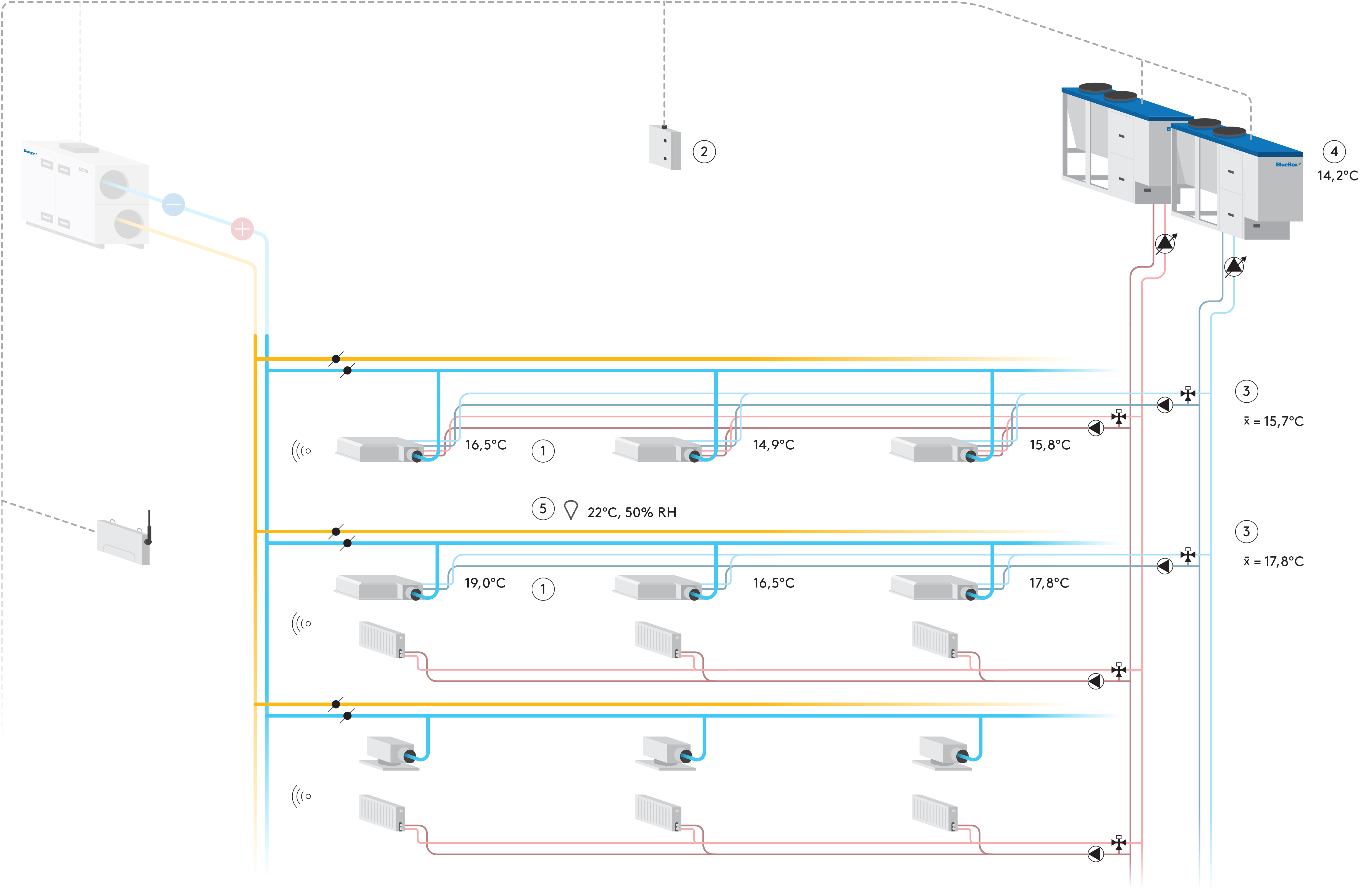 1. Each chilled beam (CB) calculates it´s needed water temperature based on the cooling demand (each floor, south/west façade).