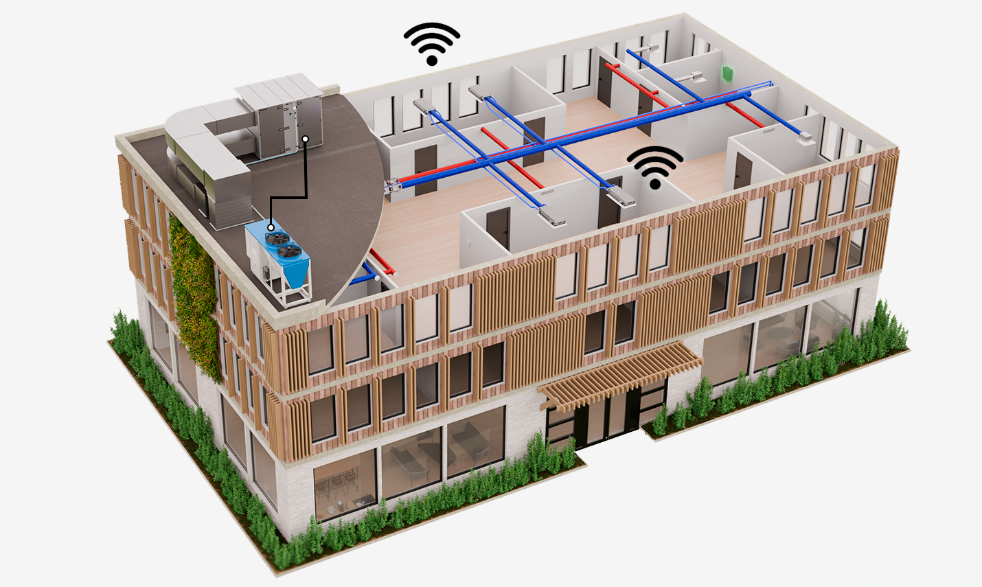 Our SMART offer includes our unique optimisation functions as well as the possibility to upgrade the air handling units in the field. Together with our future proofed chillers and heat pumps and our wireless WISE room management system this guarantees secure operation, high energy efficiency, connectivity, flexibility and low embodied and operational CO2 emissions, and easy repurposing with minimal downtime during renovations.
