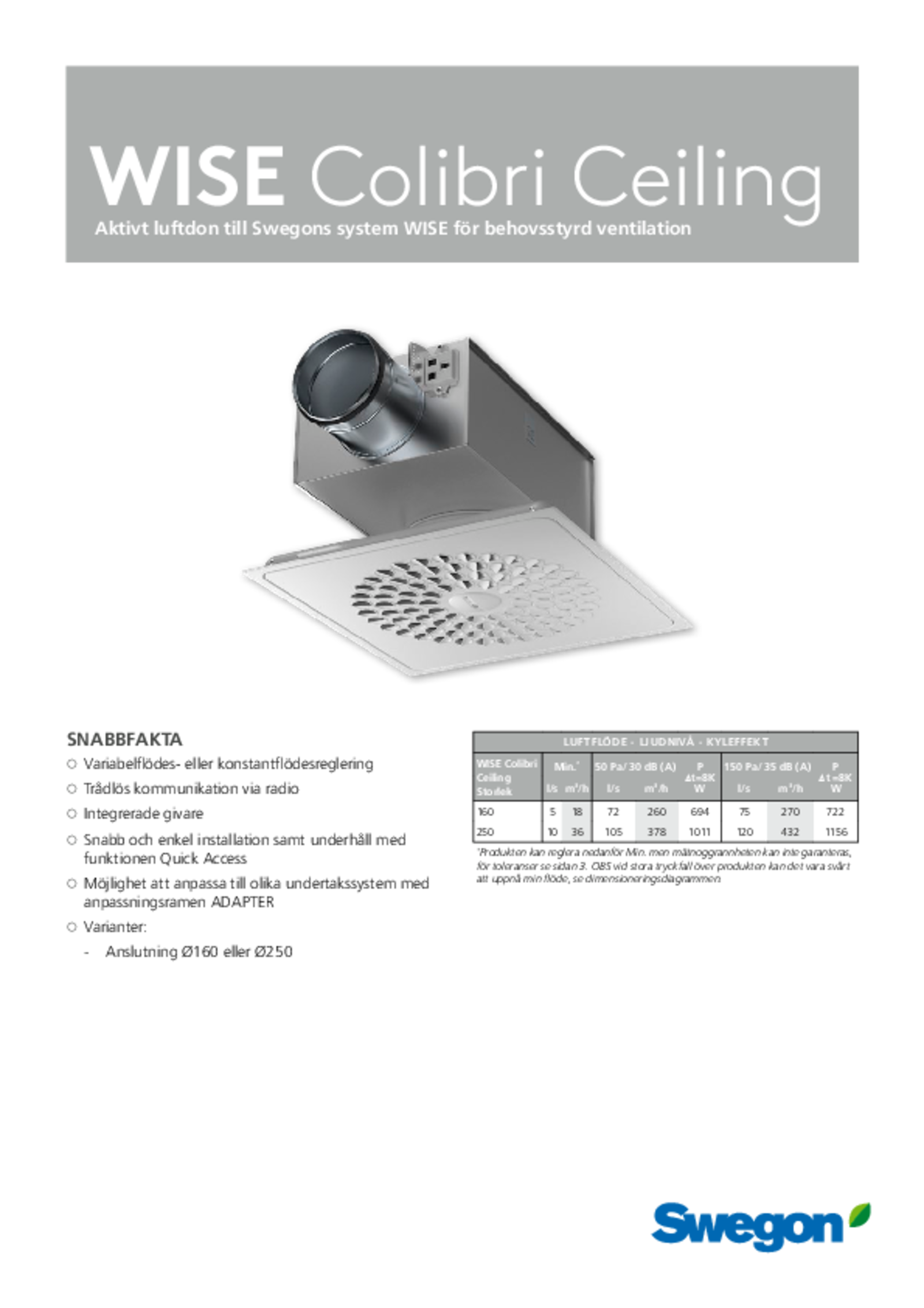 | Aktivt luftdon till Swegons system WISE för behovsstyrd ventilation (pdf 759.58kB) | WISE Colibri Ceiling a | Teknisk katalog | |