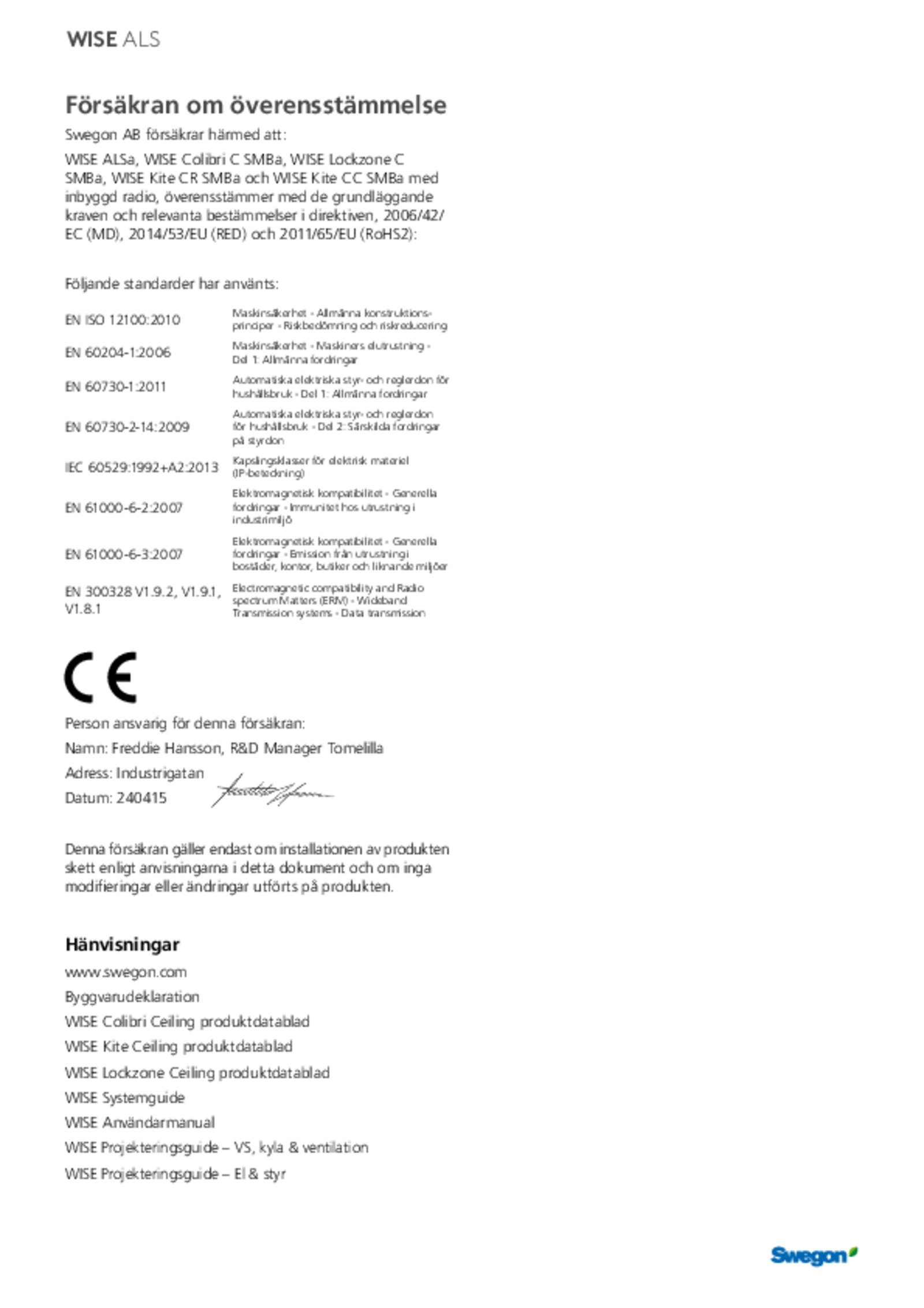 | CE-deklaration (pdf 91.65kB) | WISE ALSa, WISE Colibri C SMBa, WISE Lockzone C SMBa, WISE Kite CR SMBa, WISE Kite CC SMBa | Kvalitetsdokument | |