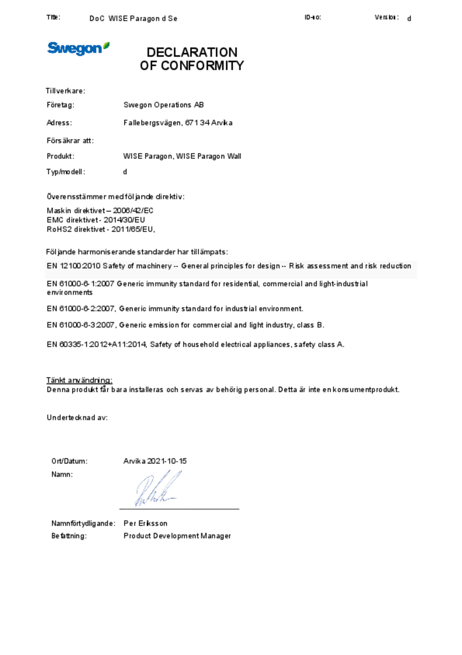 | CE-Deklaration (pdf 113.57kB) | WISE Paragon, WISE Paragon Wall | Kvalitetsdokument | |