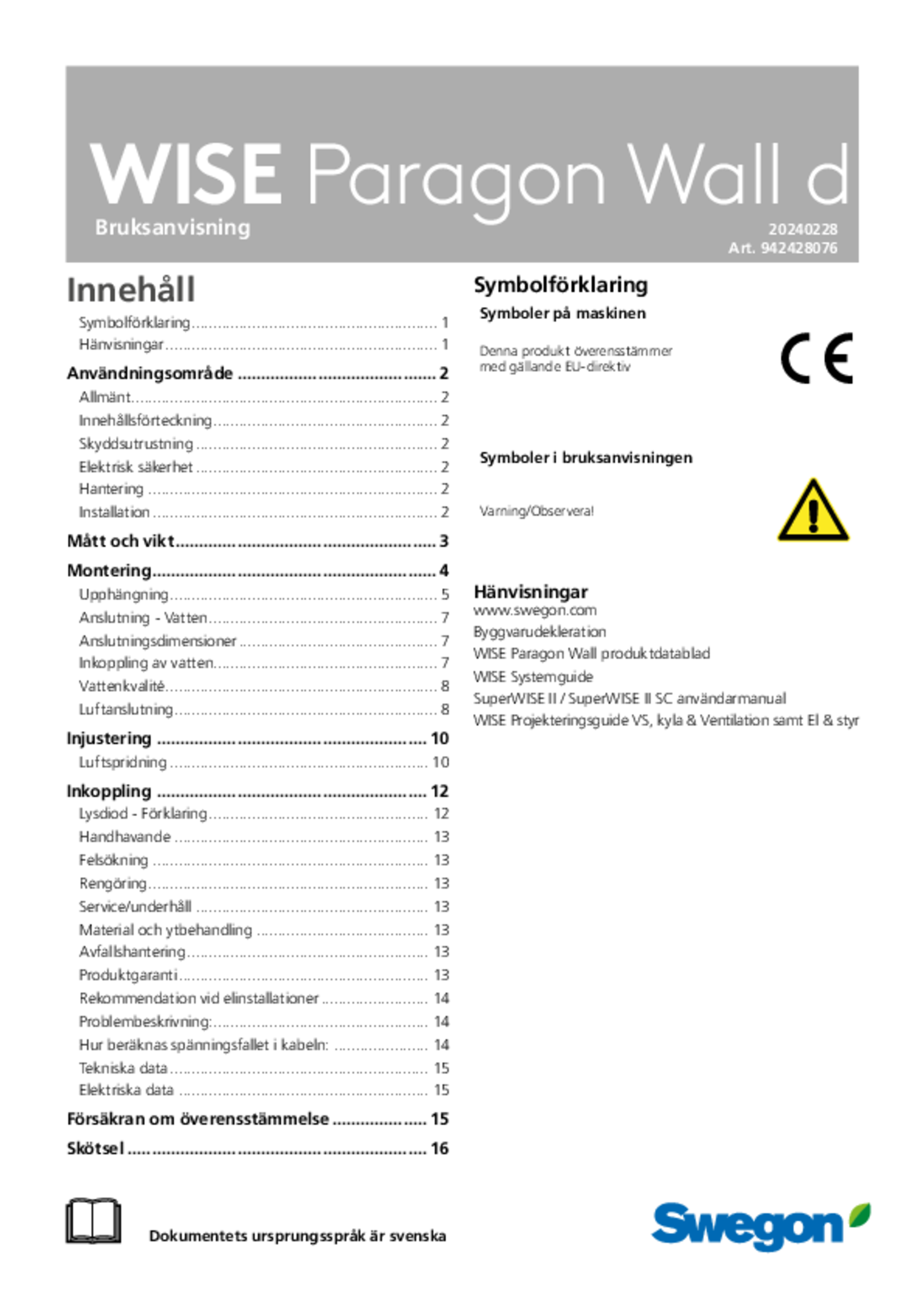 | Bruksanvisning (pdf 4.7MB) | WISE Paragon Wall | IOM-manual | |