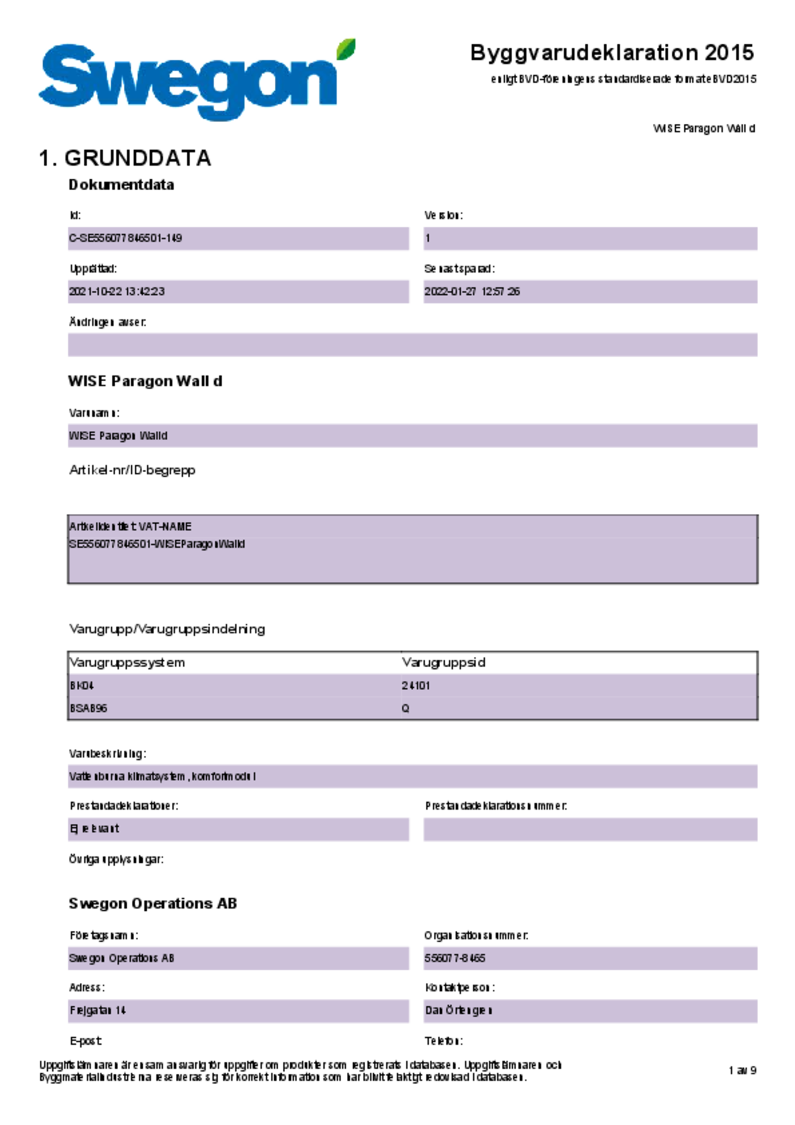 | Byggvarudeklaration (pdf 150.26kB) | WISE Paragon Wall d | Kvalitetsdokument | |