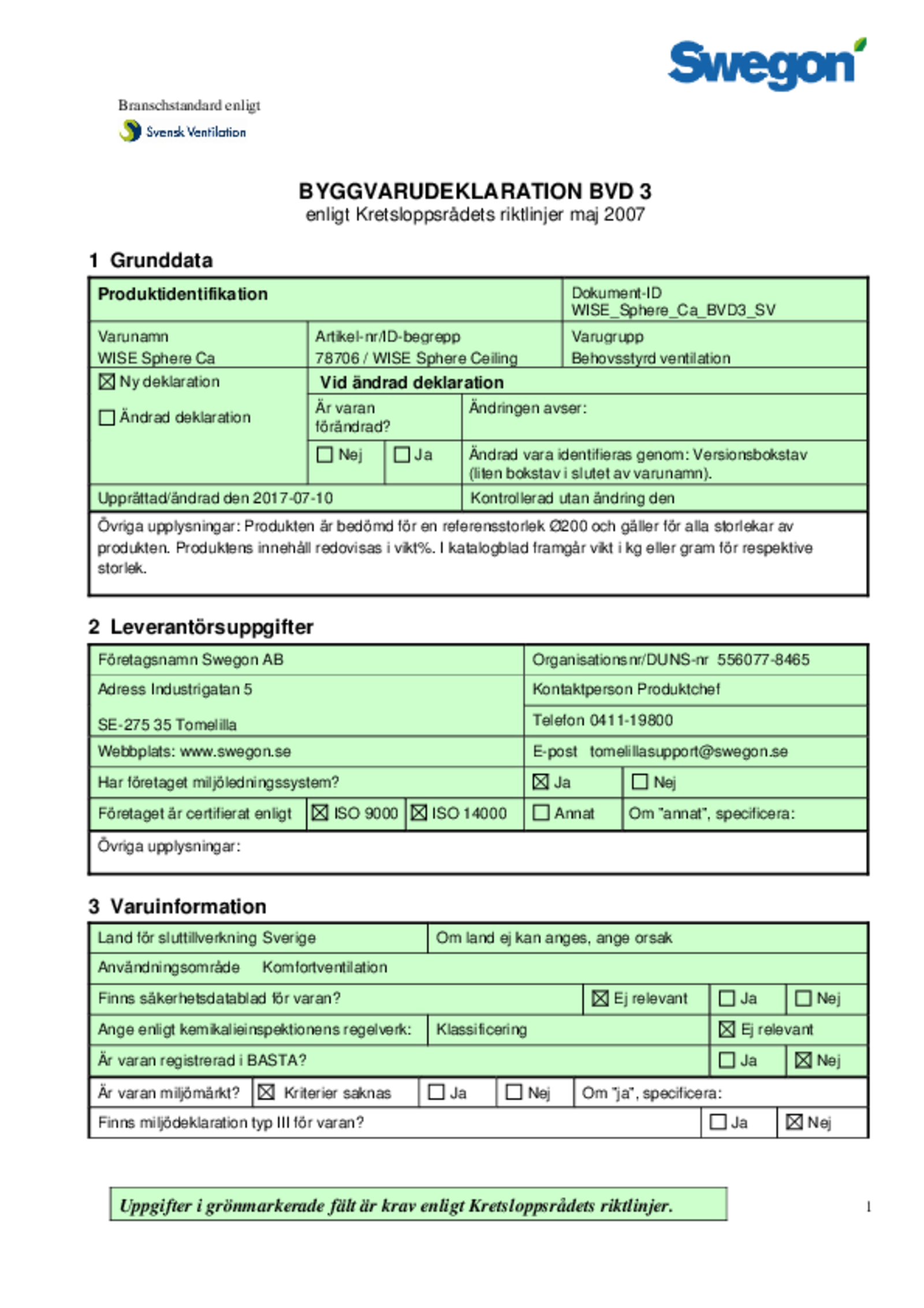 | Byggvarudeklaration (pdf 1.1MB) | WISE Sphere Ceiling a | Kvalitetsdokument | |