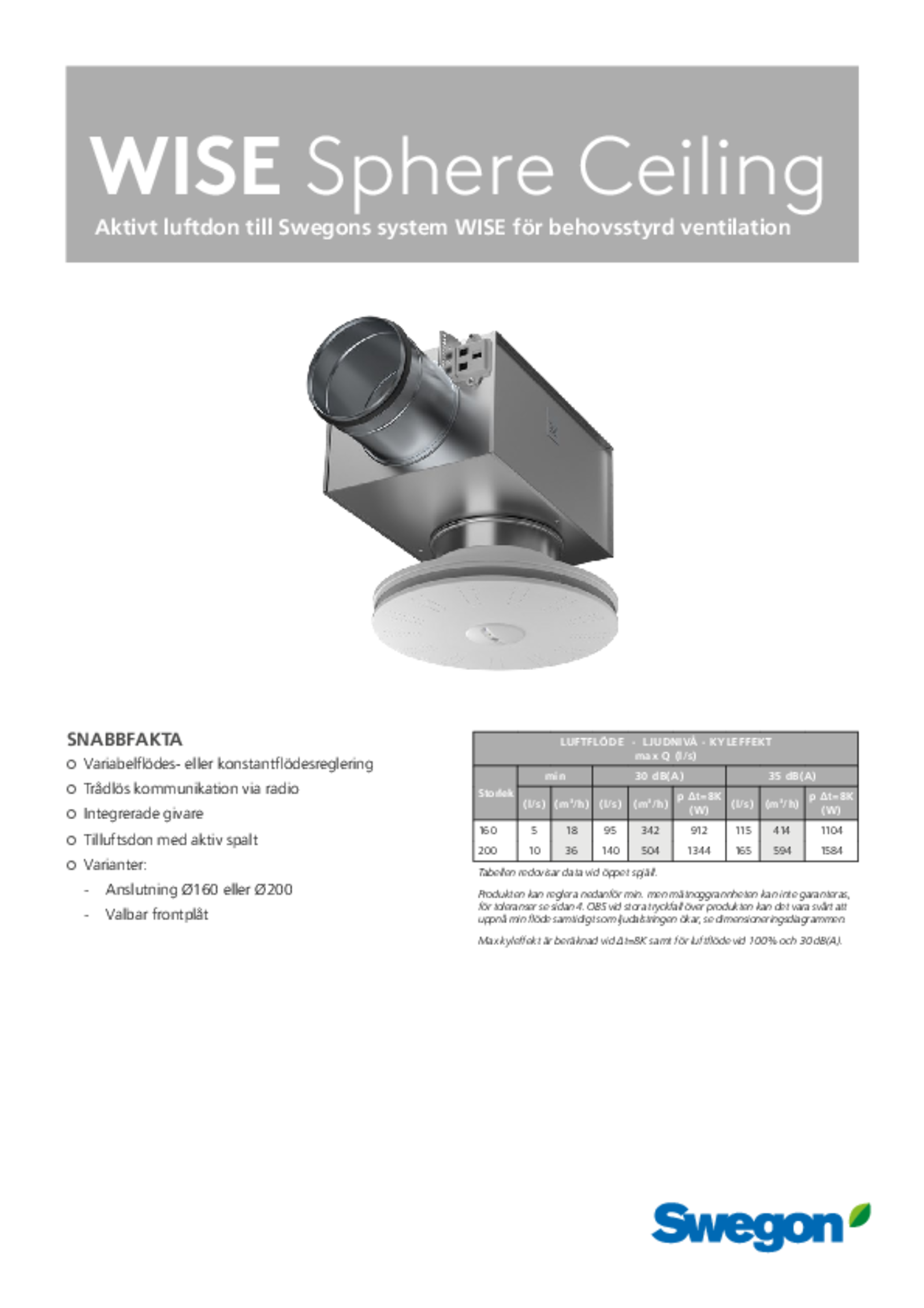 | Aktivt luftdon till Swegons system WISE för behovsstyrd ventilation (pdf 1.29MB) | WISE Sphere Ceiling c | Teknisk katalog | |