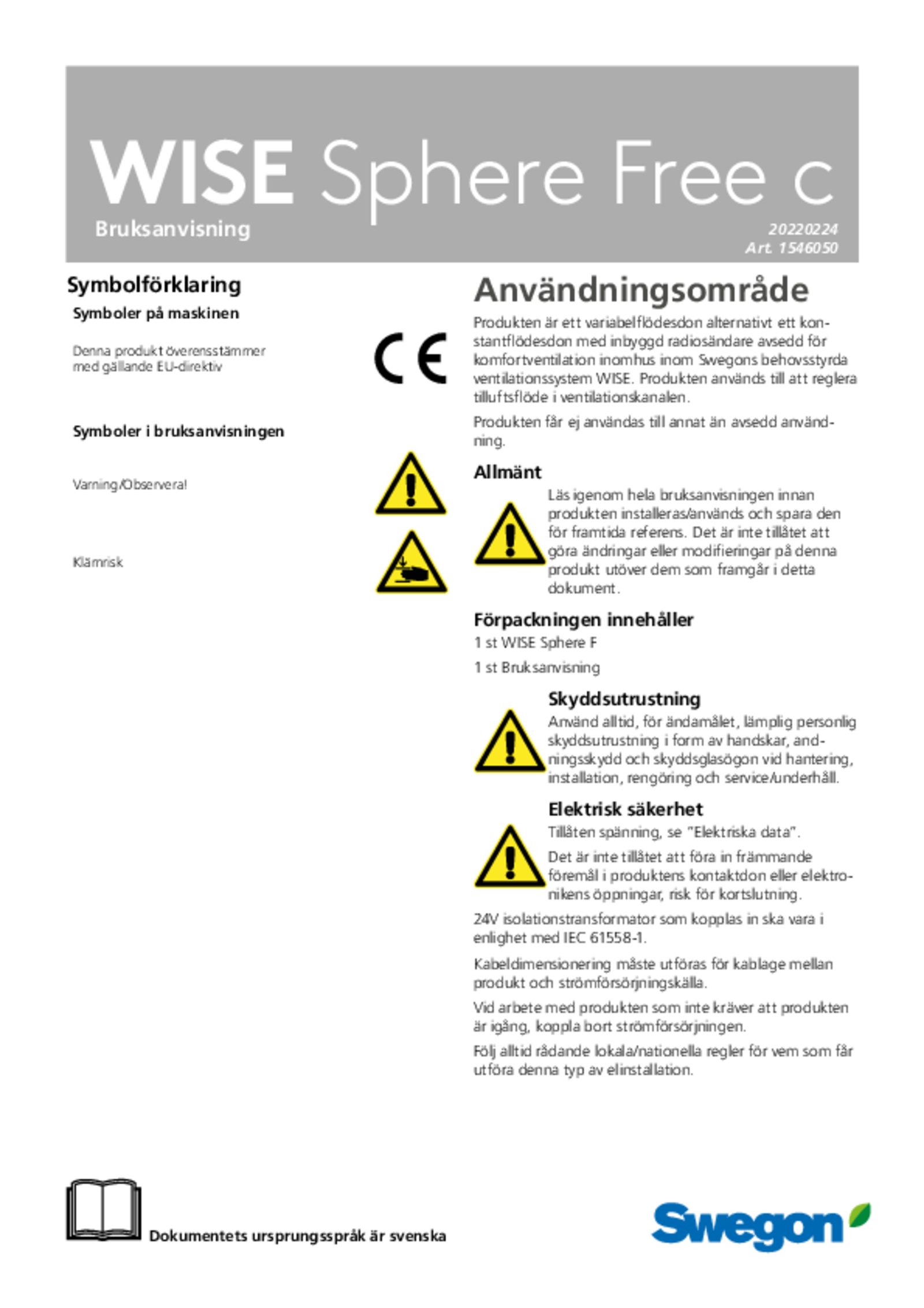 | Bruksanvisning (pdf 1.84MB) | WISE Sphere Free c | IOM-manual | |