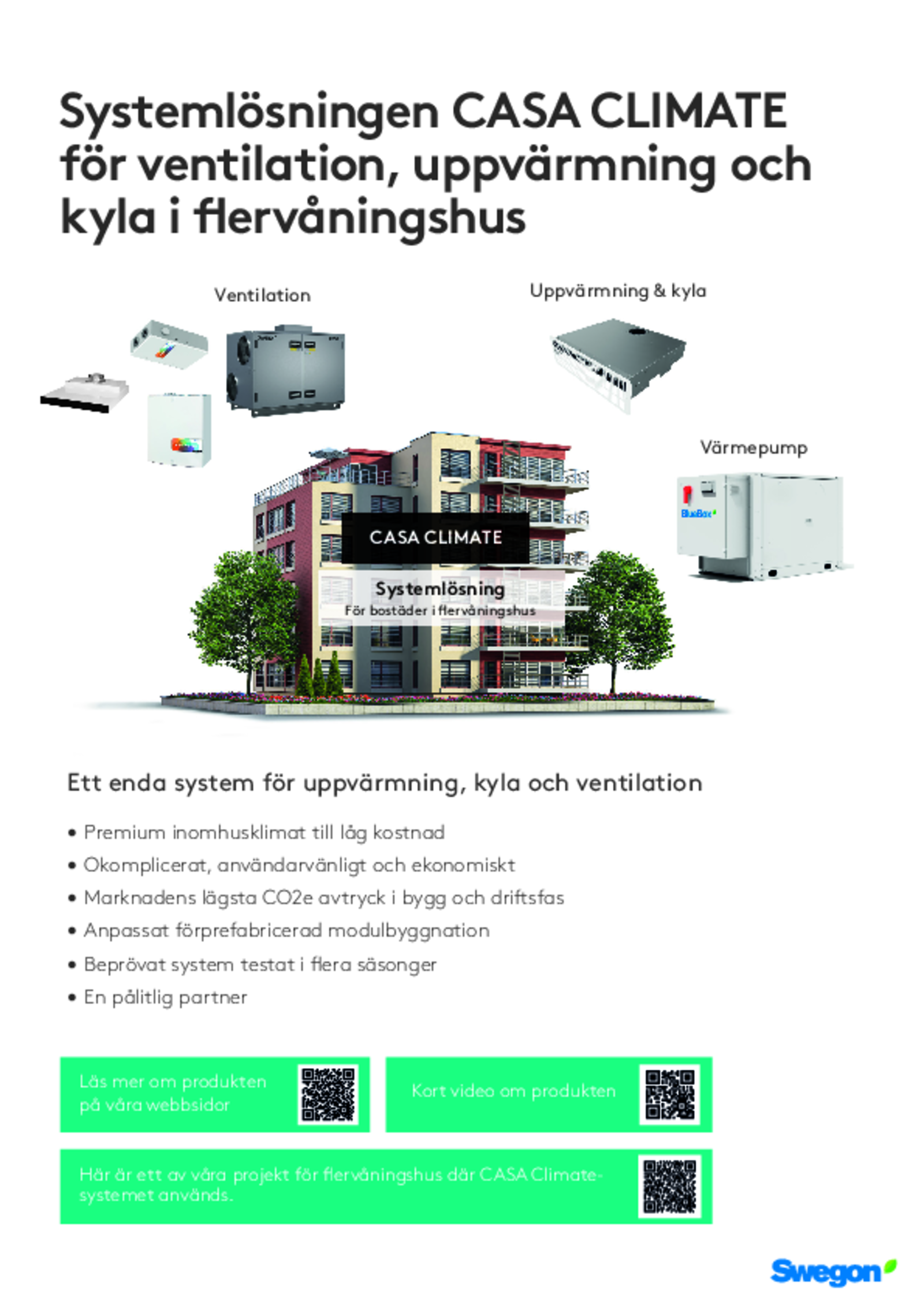 CASA Climate är ett unikt system för värme, ventilation och kyla, i flerbostadshus. En prisvärd och ekonomisk lösning som är utformad för behoven i bostäder som förenklar konstruktions- och byggprocessen eftersom de olika klimatkomponenterna arbetar sömlöst tillsammans och levereras av en och samma pålitliga partner. För de boende erbjuder modulen ett optimalt inomhusklimat som lätt kontrolleras från en manöverpanel och de olika systemen kommer inte i konflikt med varandra. För fastighetsägarens del garanterar CASA Climate energieffektiv och ekonomisk värme, kyla och ventilation under hela sin livscykel.