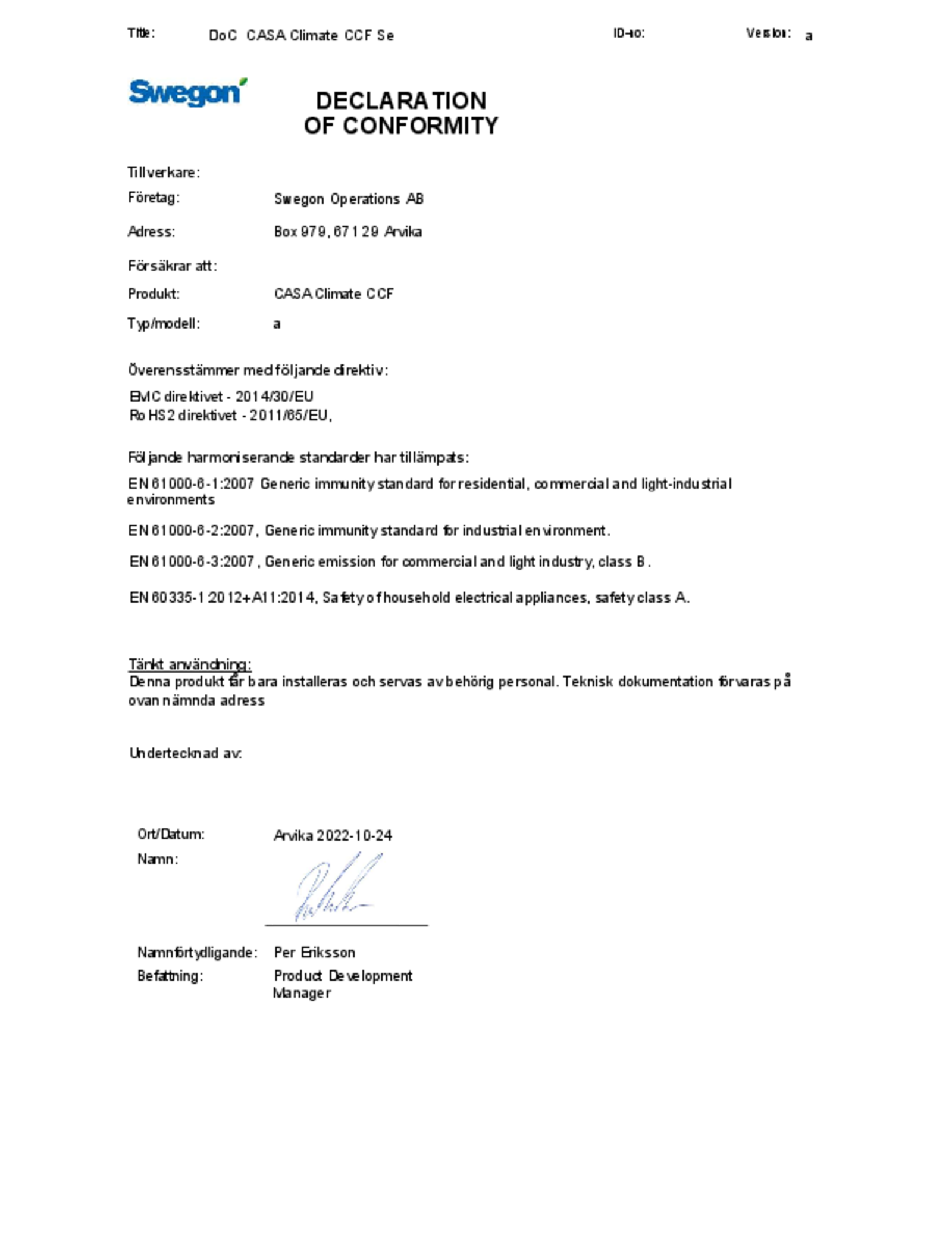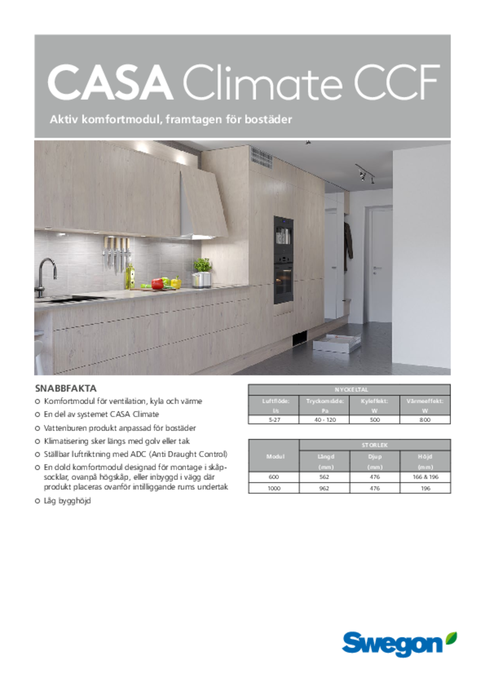 CASA CLIMATE CCF är en vattenburen komfortmodul som ansluts till lägenhetens ventilationssystem och byggnadens vattenkrets. Den tillhandahåller värme, frisk luft och eventuellt kyla till lägenheten. Beroende på behovet kan varje lägenhet ha varierande antal rumsprodukter. CCF använder sig av värme- och kylenergi från berg eller fjärrvärme/ fjärrkyla för att tillhandahålla energieffektiv klimatisering med individuell temperaturreglering för varje rum.