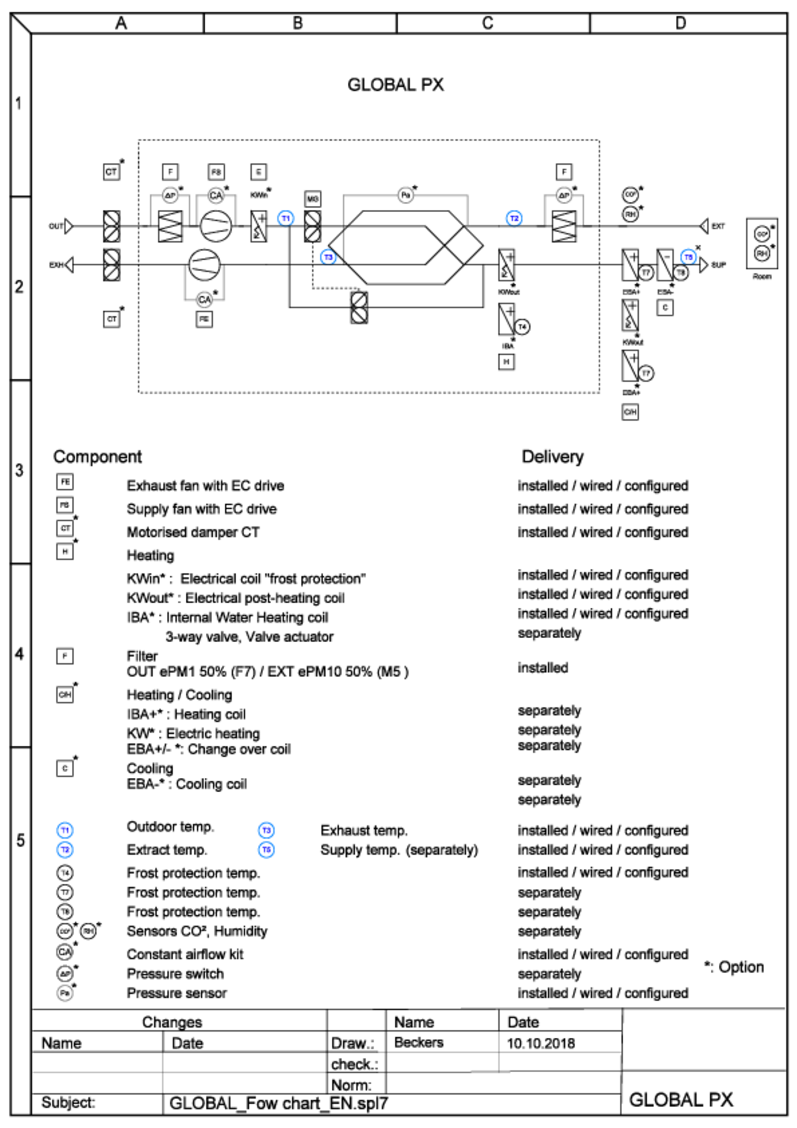 - Isolerat inbyggt hölje för extern luftvärmare/luftkylare som tillbehör (vatten/DX)