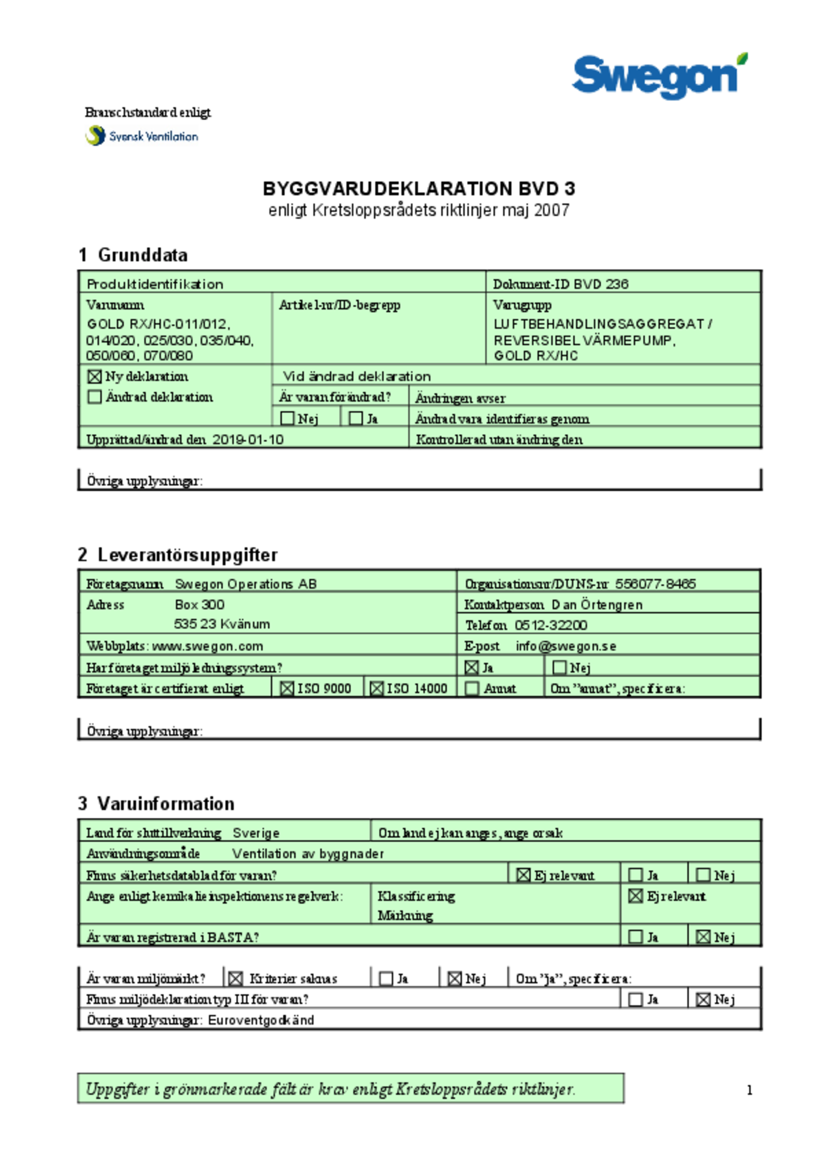 | Byggvarudeklaration (pdf 336.56kB) | GOLD RX/HC | Kvalitetsdokument | |