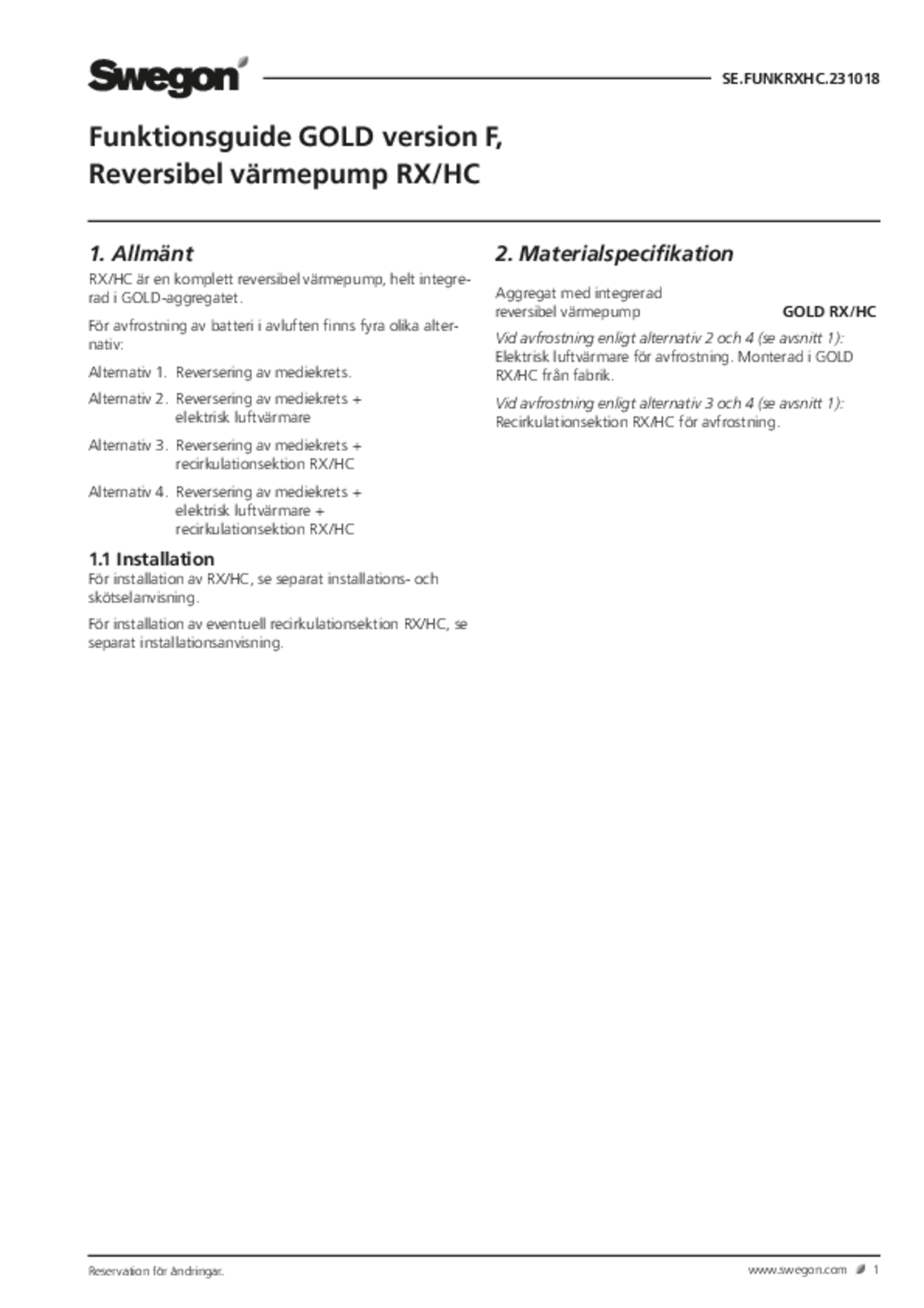 | Reversibel värmepump, funktionsguide (pdf 394.75kB) | GOLD RX/HC | IOM-manual | |