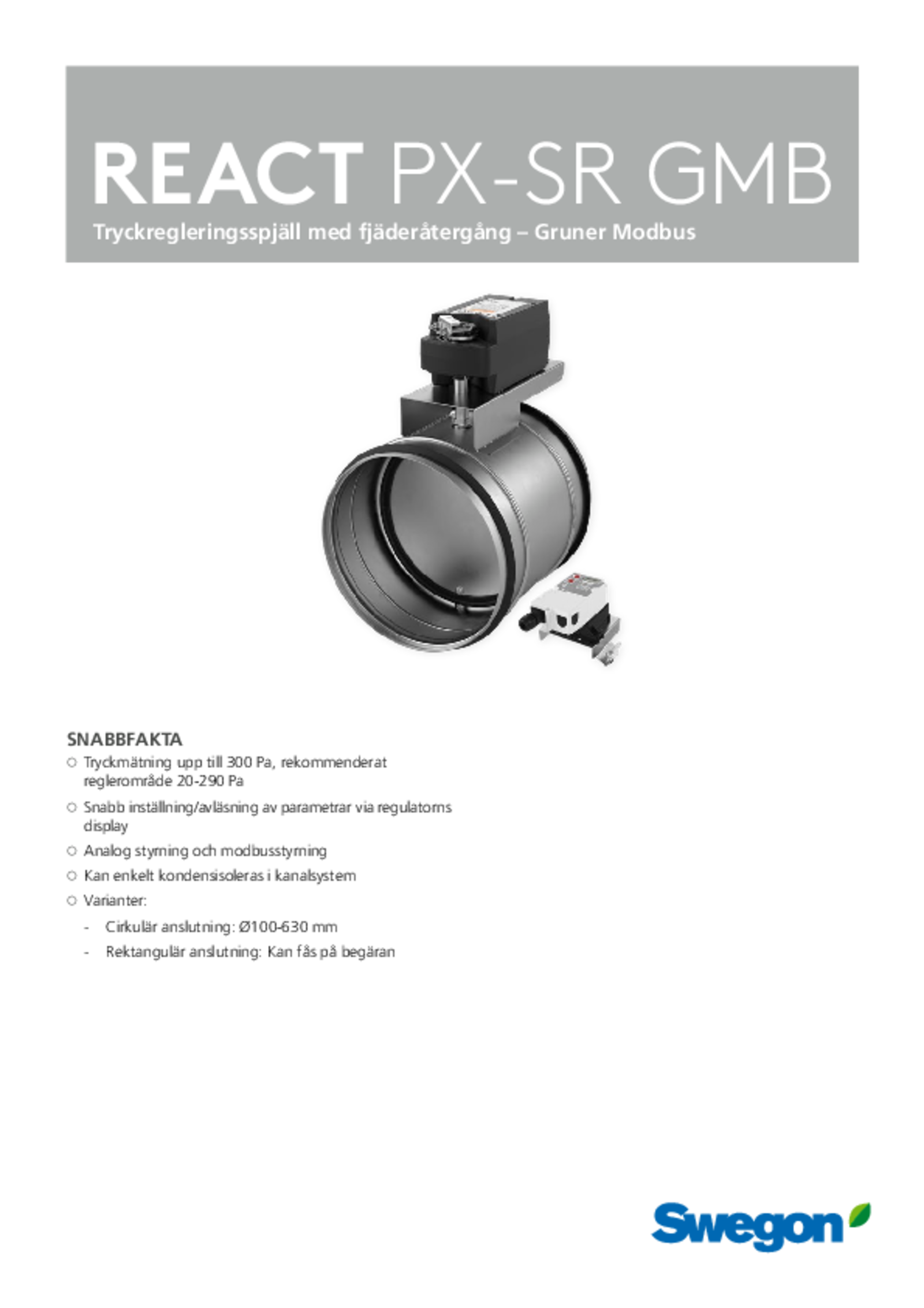 | Tryckregleringsspjäll – Gruner Modbus (pdf 1.83MB) | REACT PX GMBa (cirkulär), REACT PX GMBb (rektangulär) | Teknisk katalog | |