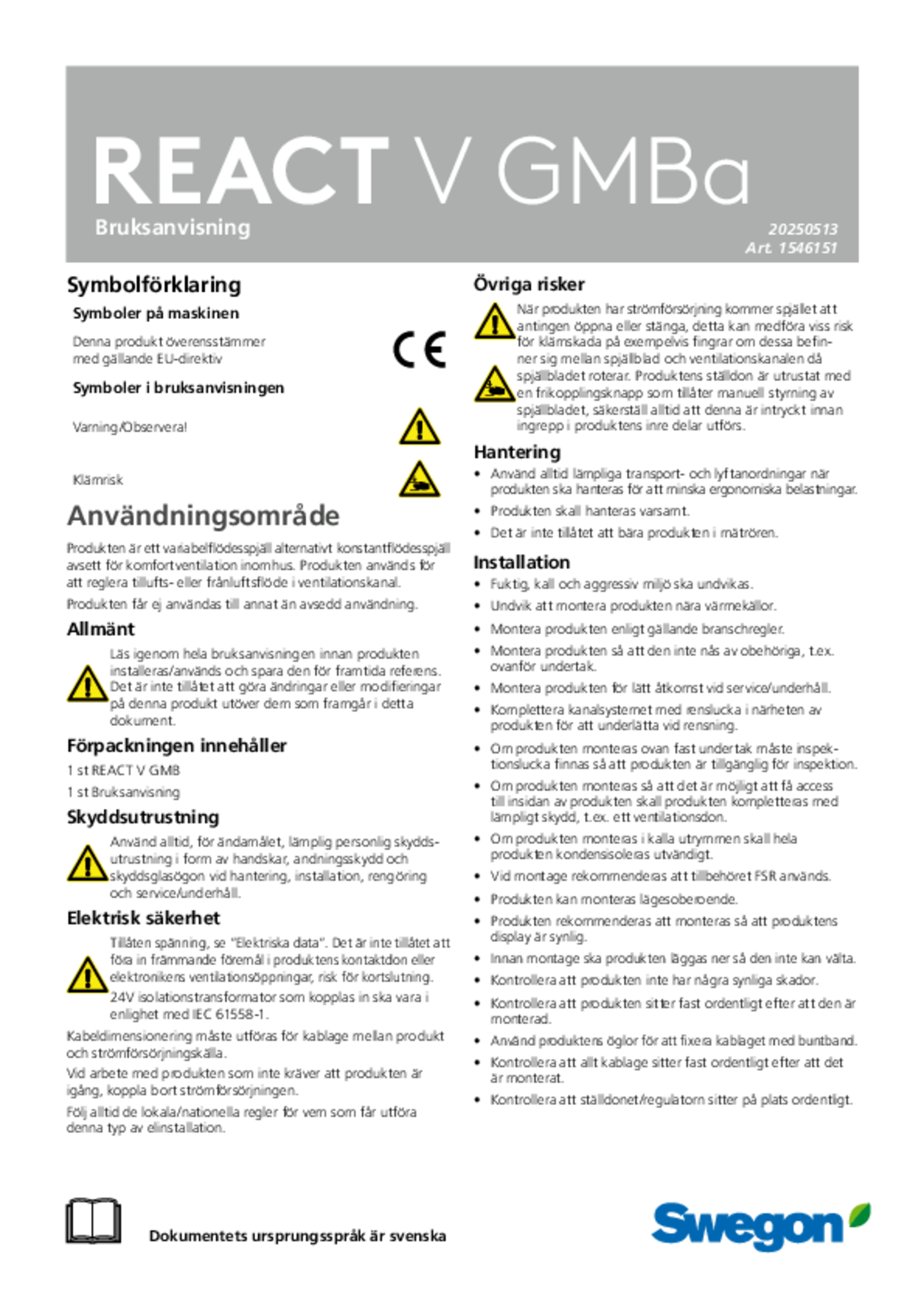 | Bruksanvisning (pdf 2.46MB) | REACT V-SR GMBa | IOM-manual | |