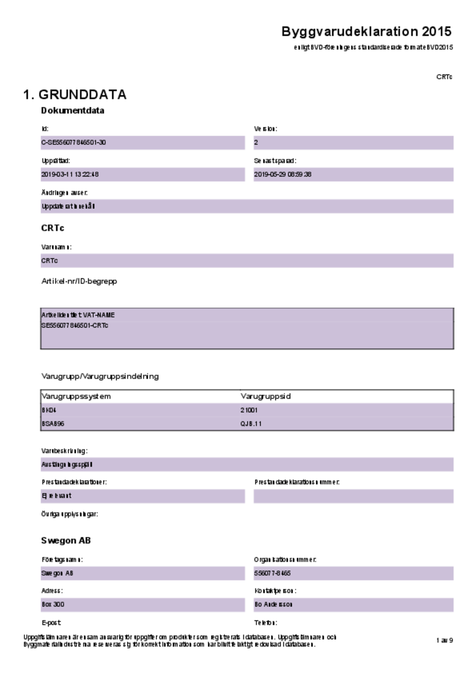 | Byggvarudeklaration (pdf 136.06kB) | CRTc | Kvalitetsdokument | |