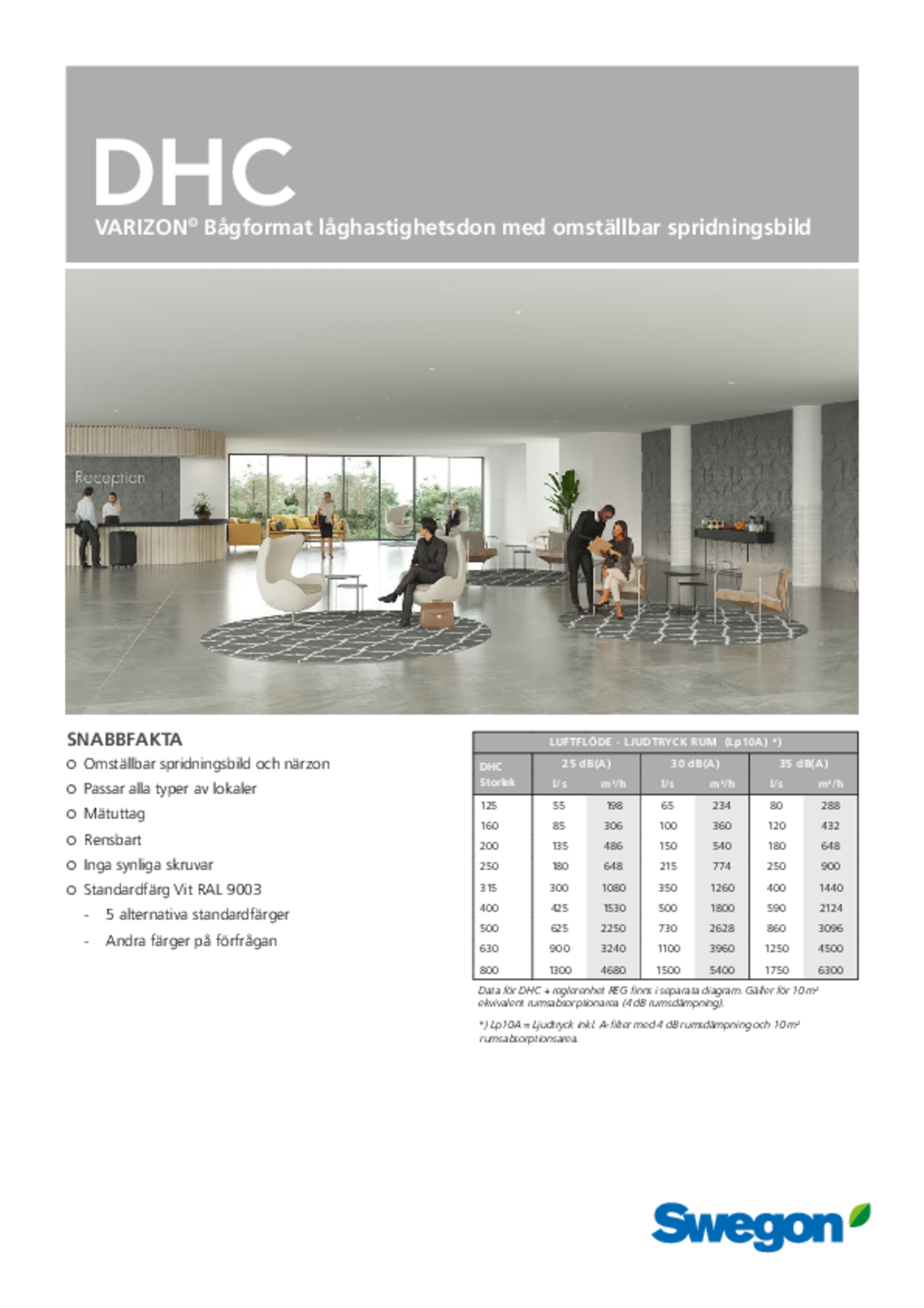 DHC är ett komplett, halvcirkulärt deplacerande luftdon för väggmontage, vilket tillför luft med låg hastighet till vistelsezonen. Spridningsbilden är lätt ställbar tack vare ställbara dysor. Som tillbehör till finns golvsockel, kanalinklädnad och reglerenhet.
