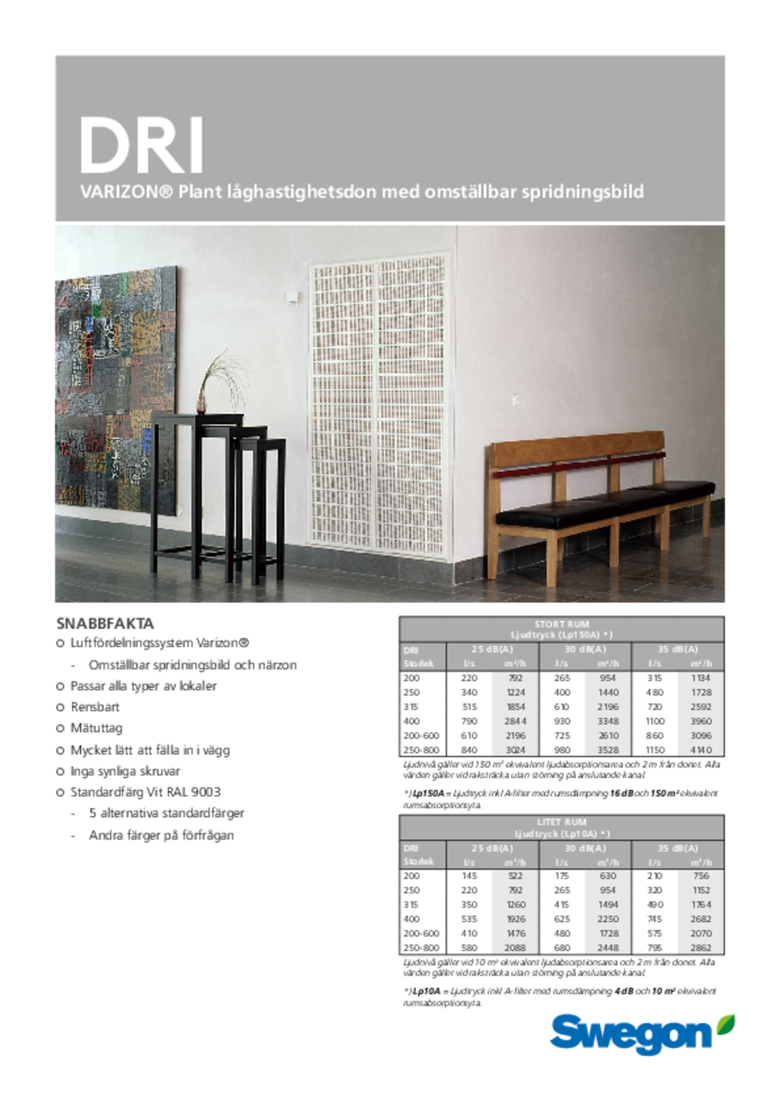 DRI är ett komplett rektangulärt deplacerande luftdon för placering mot vägg eller tak, utanpåliggande eller infällt. Det kan tillföra stort luftflöde med låg hastighet till vistelsezonen. Spridningsbilden är lätt omställbar tack vare donets ställbara luftriktare.