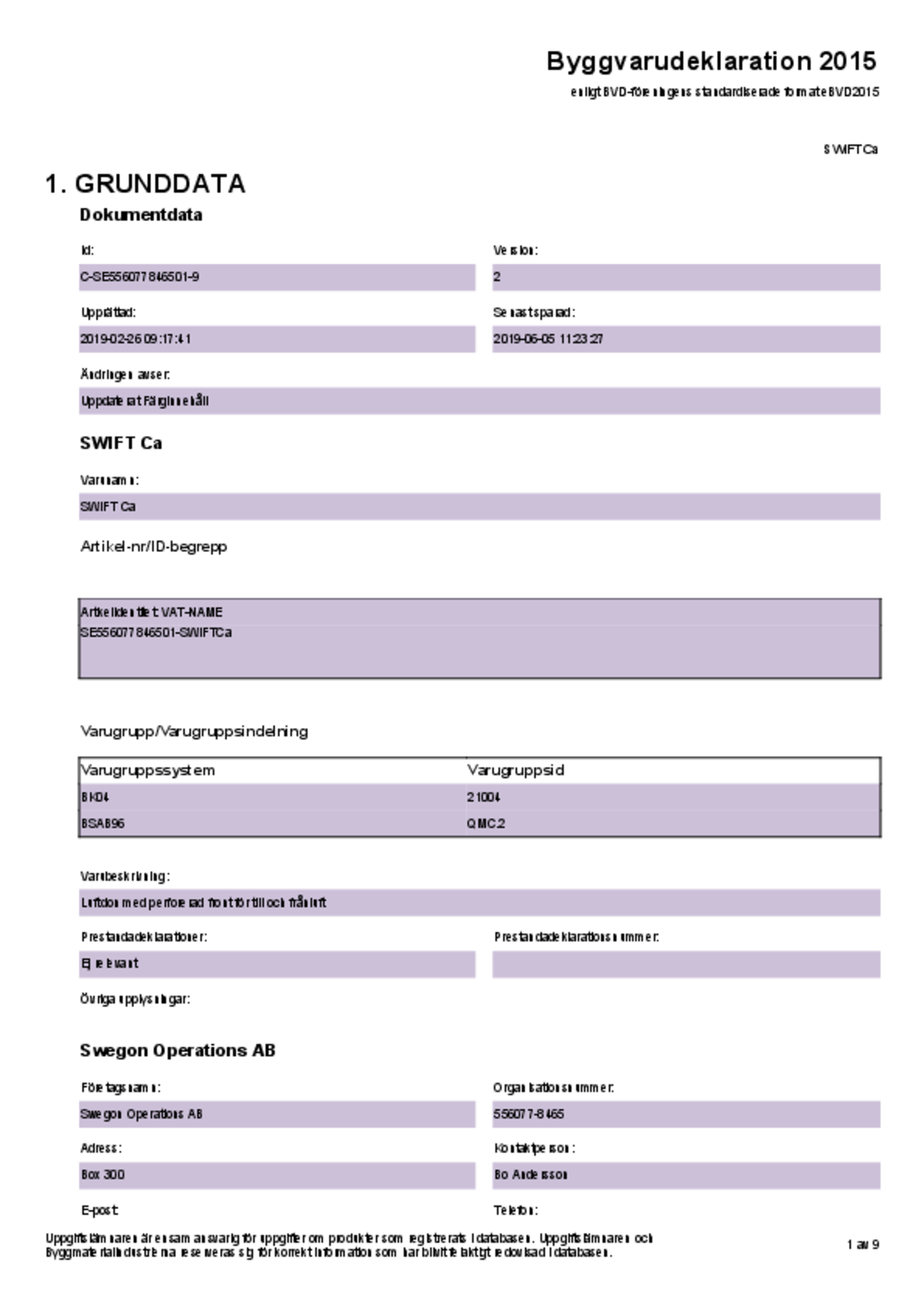 | Byggvarudeklaration (pdf 137.32kB) | SWIFT Ceiling a | Kvalitetsdokument | |