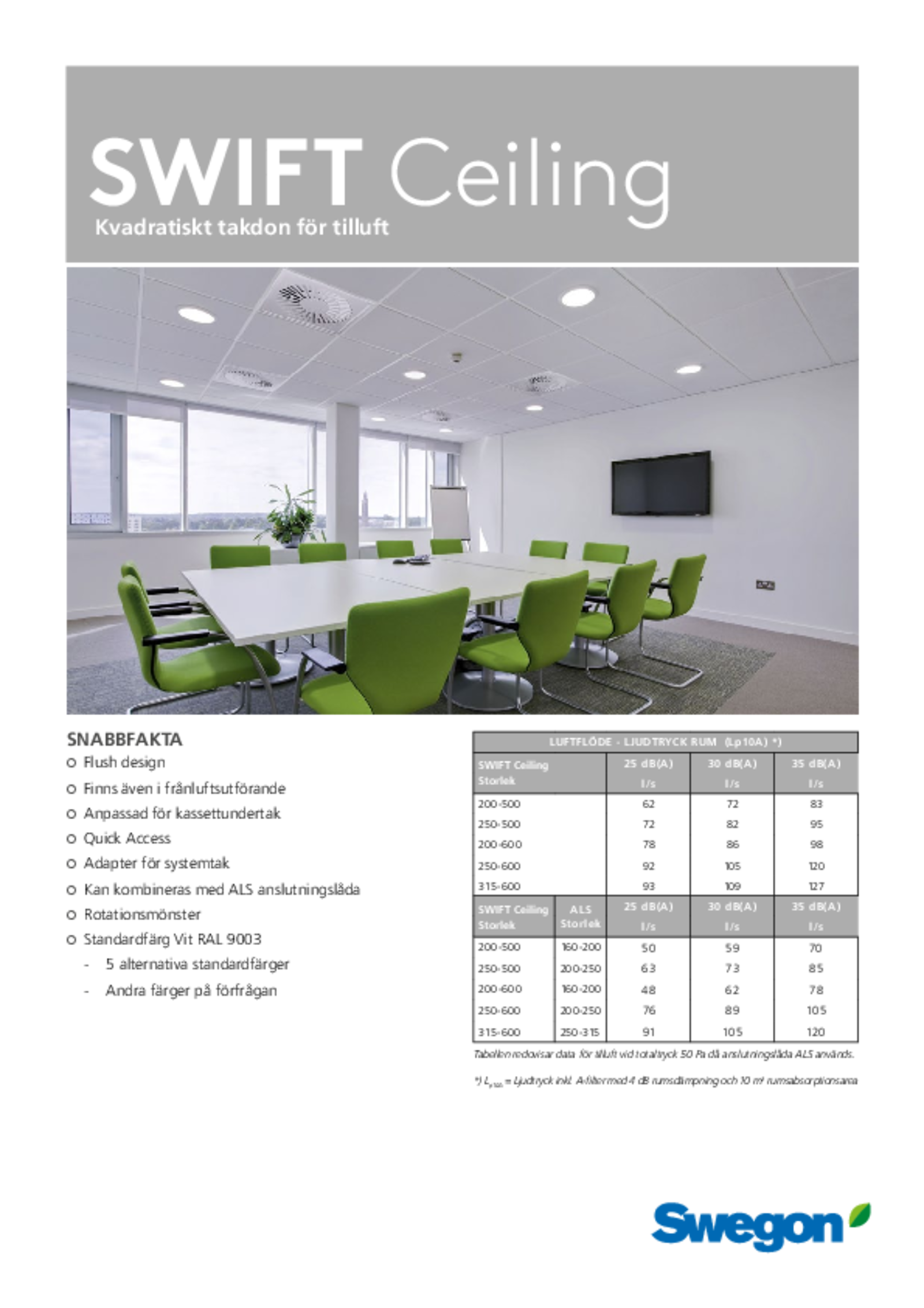 | SWIFT Ceiling Storlek | Â l/s | |||