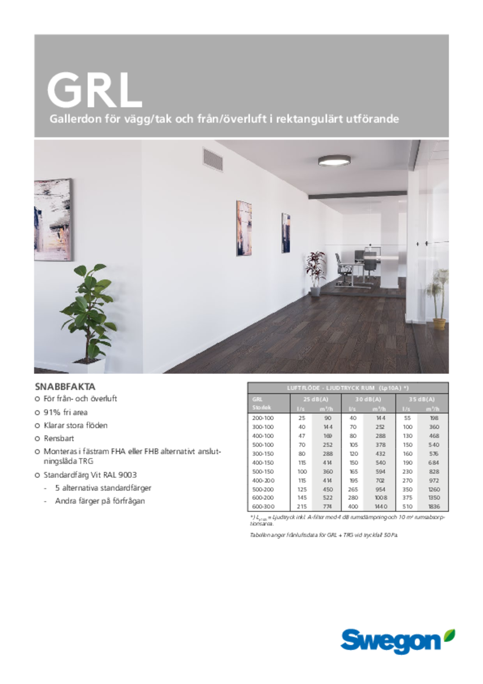 GRL är ett rektangulärt galler med mycket stor fri area. Detta ger litet tryckfall, vilket gör GRL lämpligt för höga luftvolymflöden. För reglering eller mätning av luftflöde måste GRL användas med anslutningslåda TRG.