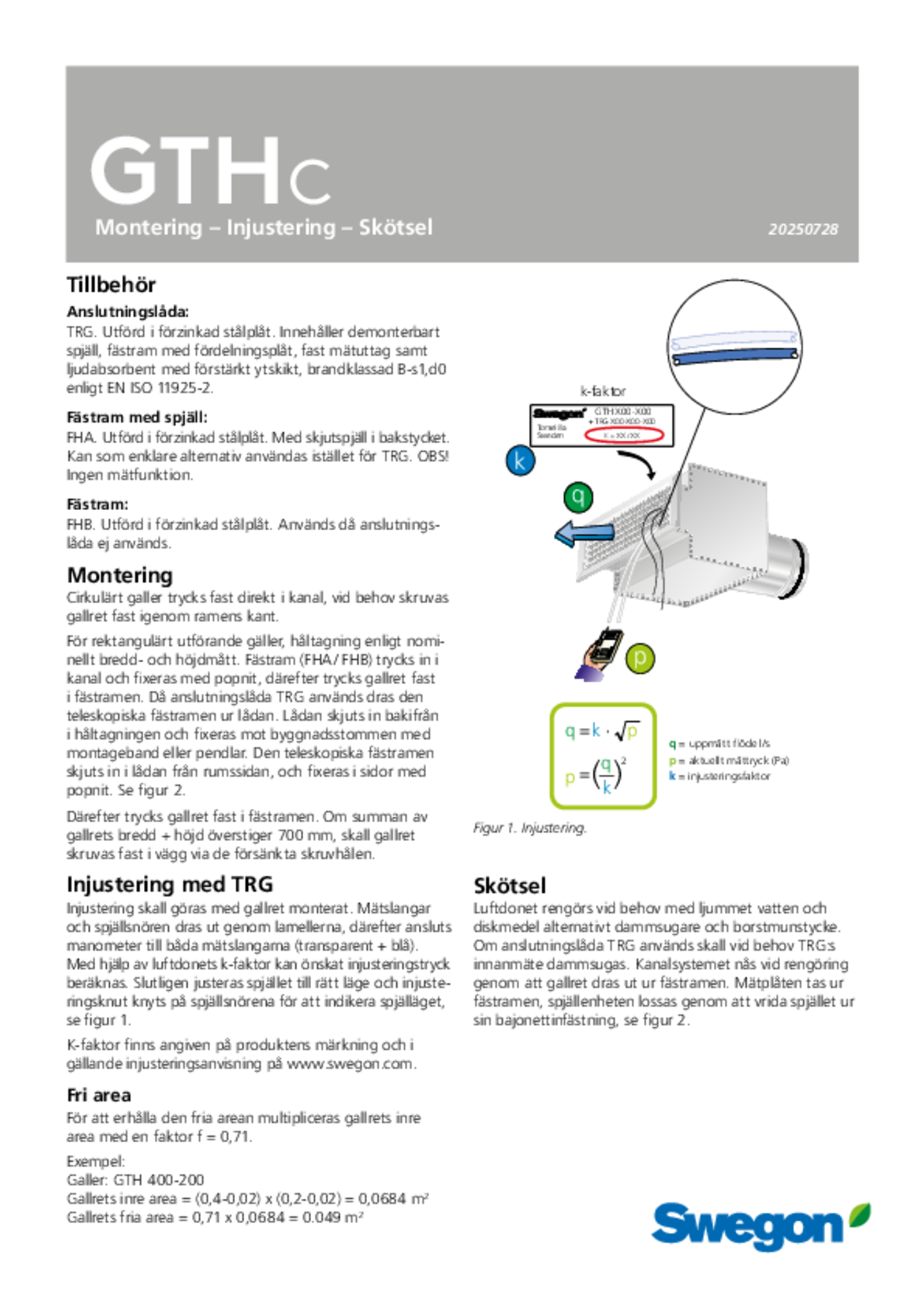 GTH är ett rektangulärt galler för tilluft. Avsett för montage på vägg. Gallret har både horisontella och vertikala luftriktare, vilka enkelt kan ställas in till korrekt kastlängd och spridningsbild för över- eller undertemperaturkonditionering, luftdonets placering, möbler i lokalen och hinder för luftflödet. För reglering eller mätning av kastlängd måste GTH användas med anslutningslåda TRG.