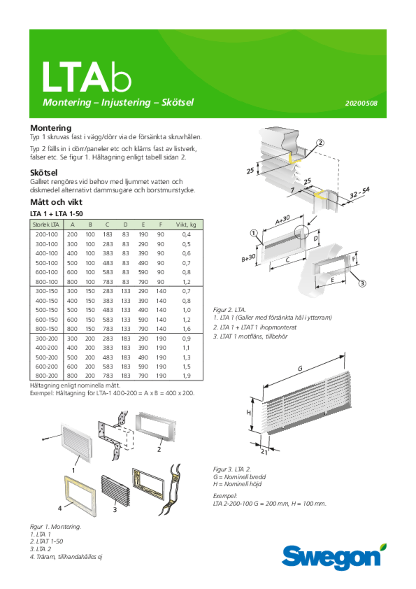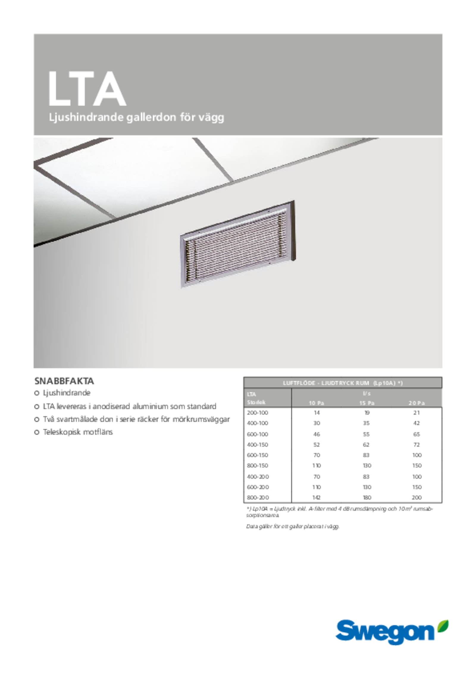 LTA är ett rektangulärt galler för installation i väggar eller dörrar. Produkten används som tillufts- eller överluftsdon mellan lokaler där ljusgenomsläpp inte önskas.