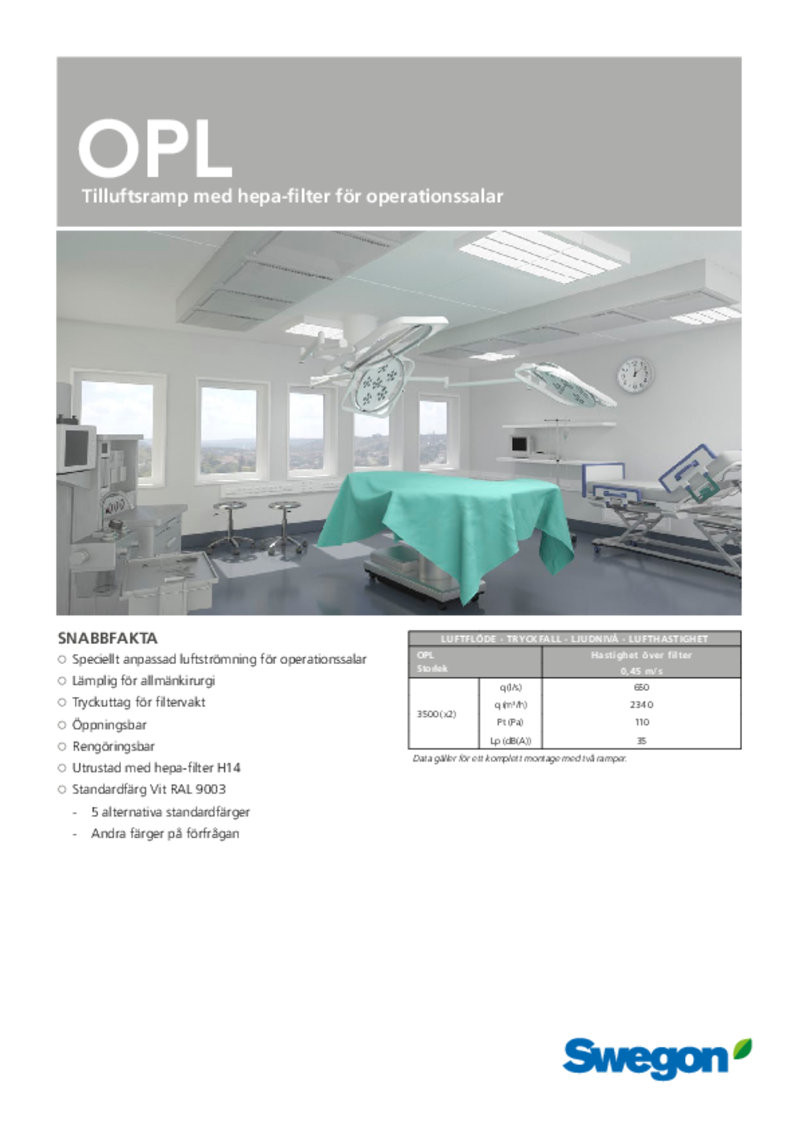 OPL är en tilluftsramp med fem perforerade luftdonsdelar och två HEPA-filter. Ramperna är specialkonstruerade för ventilation av operationssalar och monteras parvis i taket. Panelernas placering till varandra och de olika flödesriktningarna från luftdonsdelarna säkerställer en ren zon med filtrerad luft tillsammans med låg lufthastighet i området närmast patienten. Rampen används med konstant luftflöde och konstant undertemperatur och arbetar utan induktion av förorenad rumsluft.