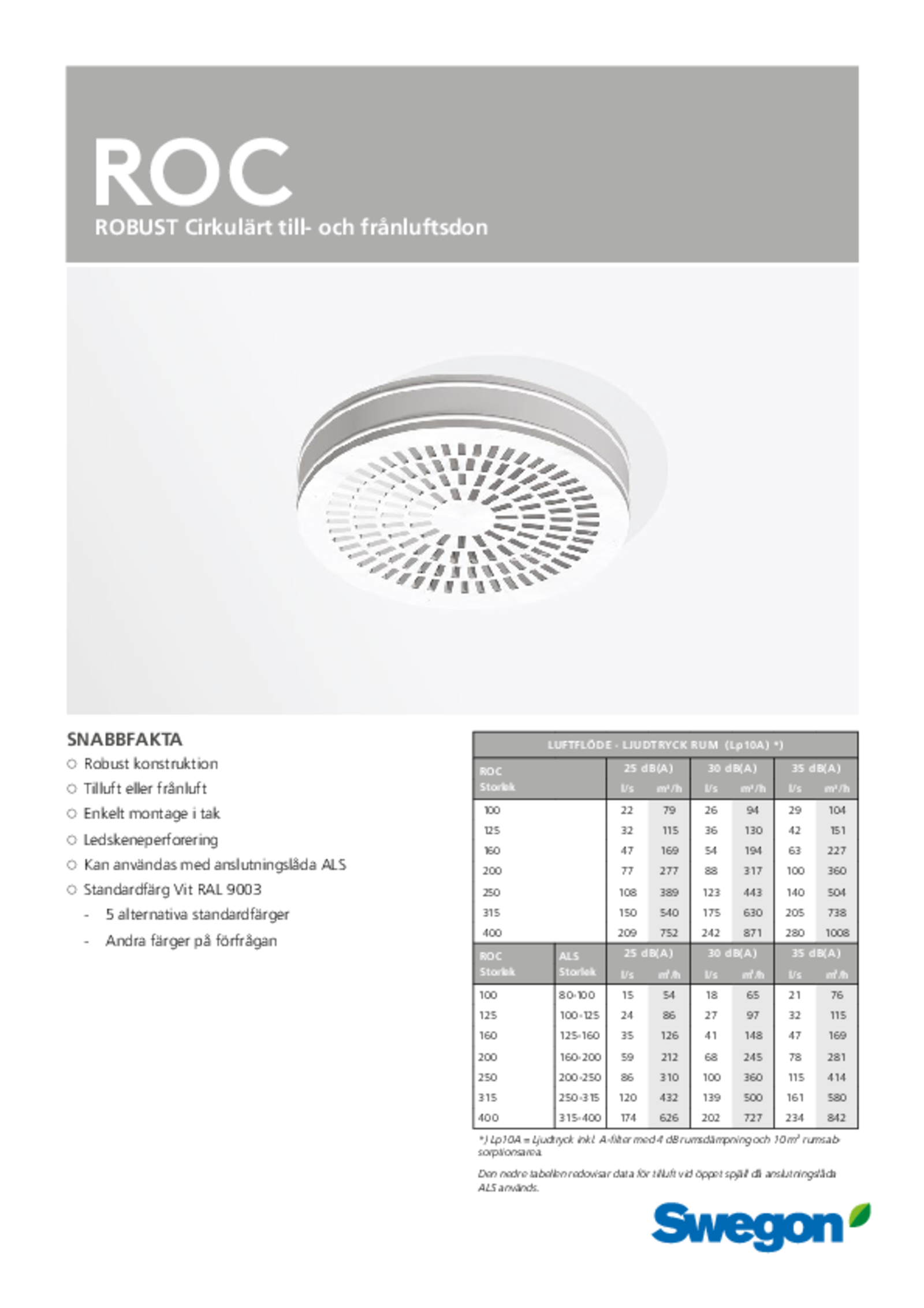 Swegons förstärkta cirkulära don typ ROC med anslutningslåda ALS och följande funktioner: