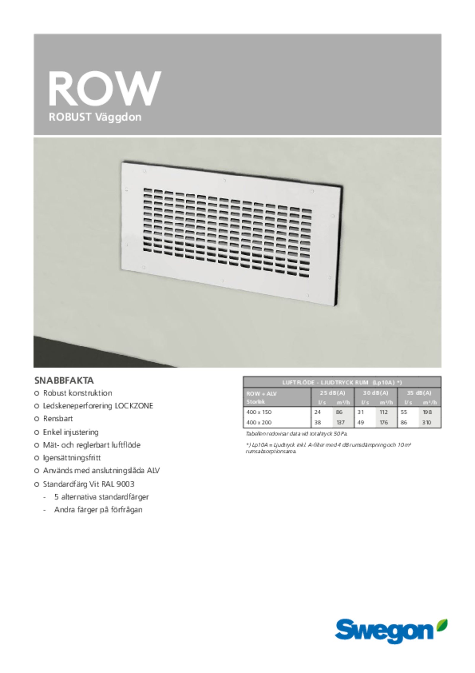 ROW är ett förstärkt tilluftsdon för väggmontage. Luftdonet är godkänt för användning i fängelser, ungdomsvårdsanstalter, vårdanläggningar, skolor etc. Luftdonsytan har perforerade ledskenor, vilket ger både kontrollerad spridningsbild och tilltalande utseende. Passar för konstant eller variabelt flöde. ROW kan också användas för liten deplacering.
