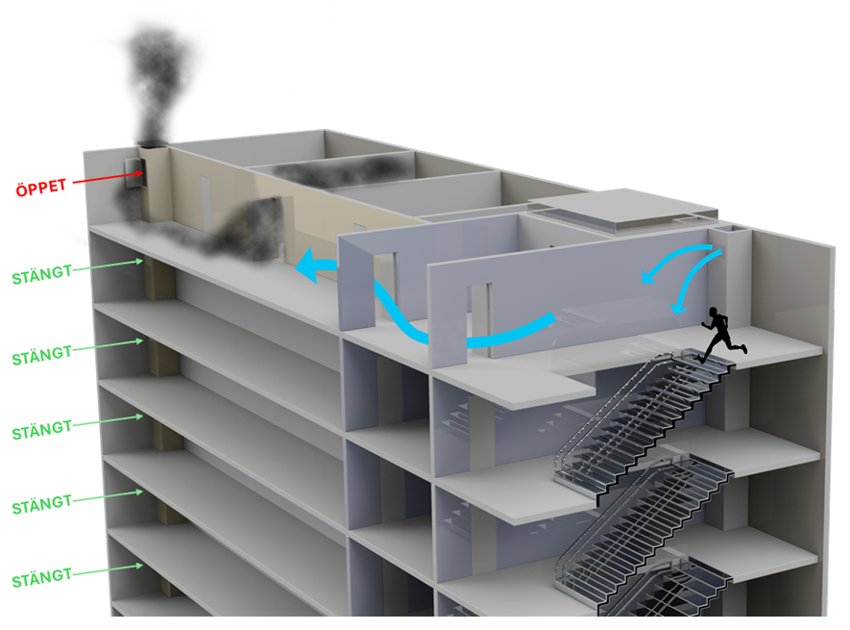 I denna typ av system kan utrymningsvägar säkras genom att aktivt styra hur röken evakueras från byggnaden vid brand med hjälp av fläktar och trycksättning med frisk luft. Detta för att skapa säkra utrymningsvägar och hjälpa räddningstjänsten. I detta exempel finns en individuell larmpunkt (rökdetektor) på varje våningsplan som försätter spjället (tillhörande samma våningsplan) i öppet läge och startar fläktar. Övriga våningsplan med tillhörande spjäll som också betjänas av det gemensamma schaktet hålls stängda med intakt brandmotstånd.