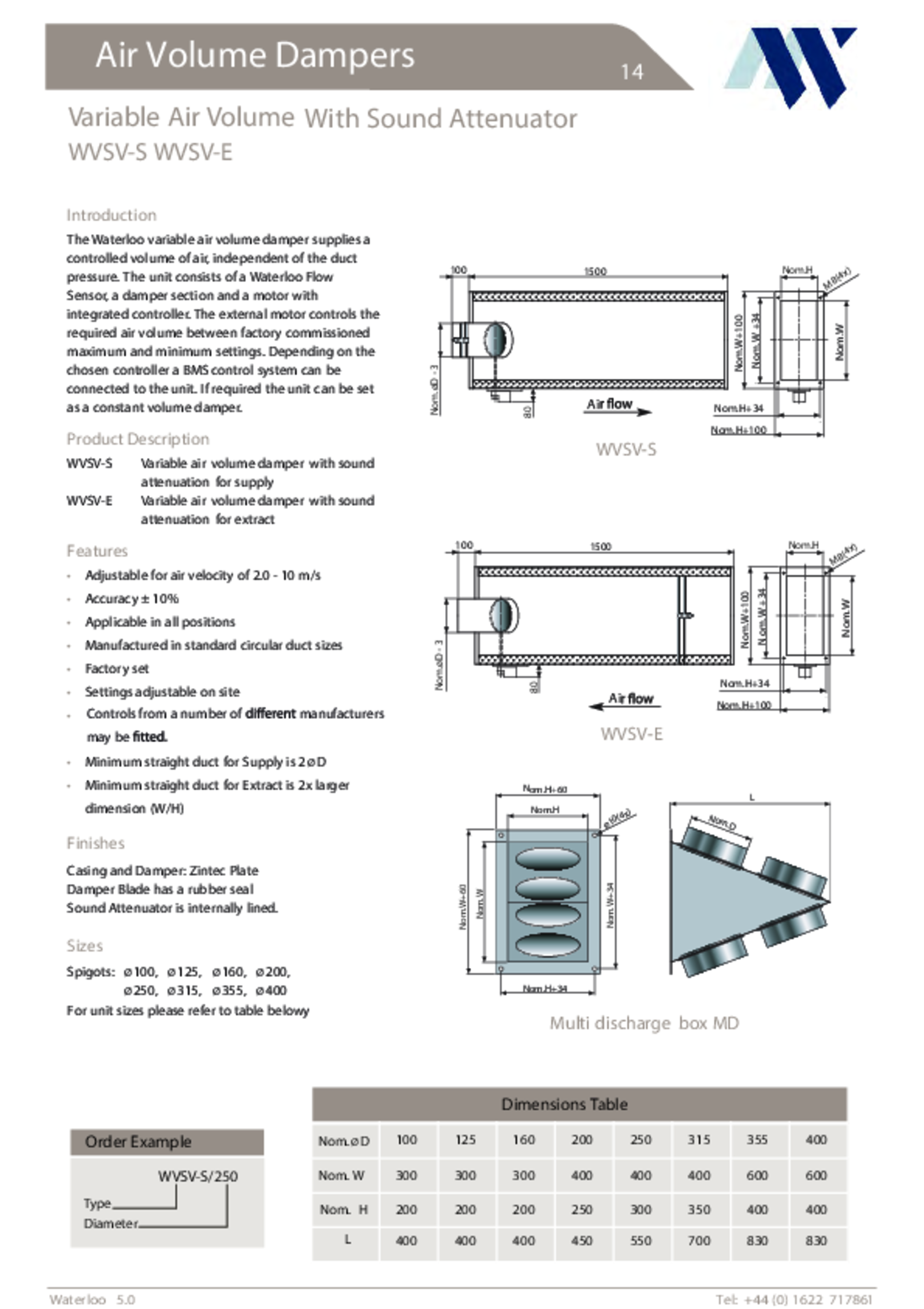 The Waterloo variable air volume damper supplies a controlled volume of air, independent of the duct pressure. The unit consists of a Waterloo Flow Sensor, a damper section and a motor with integrated controller. The external motor controls the required air volume between factory commissioned maximum and minimum settings. Depending on the chosen controller a BMS control system can be connected to the unit. If required the unit can be set as a constant volume damper.