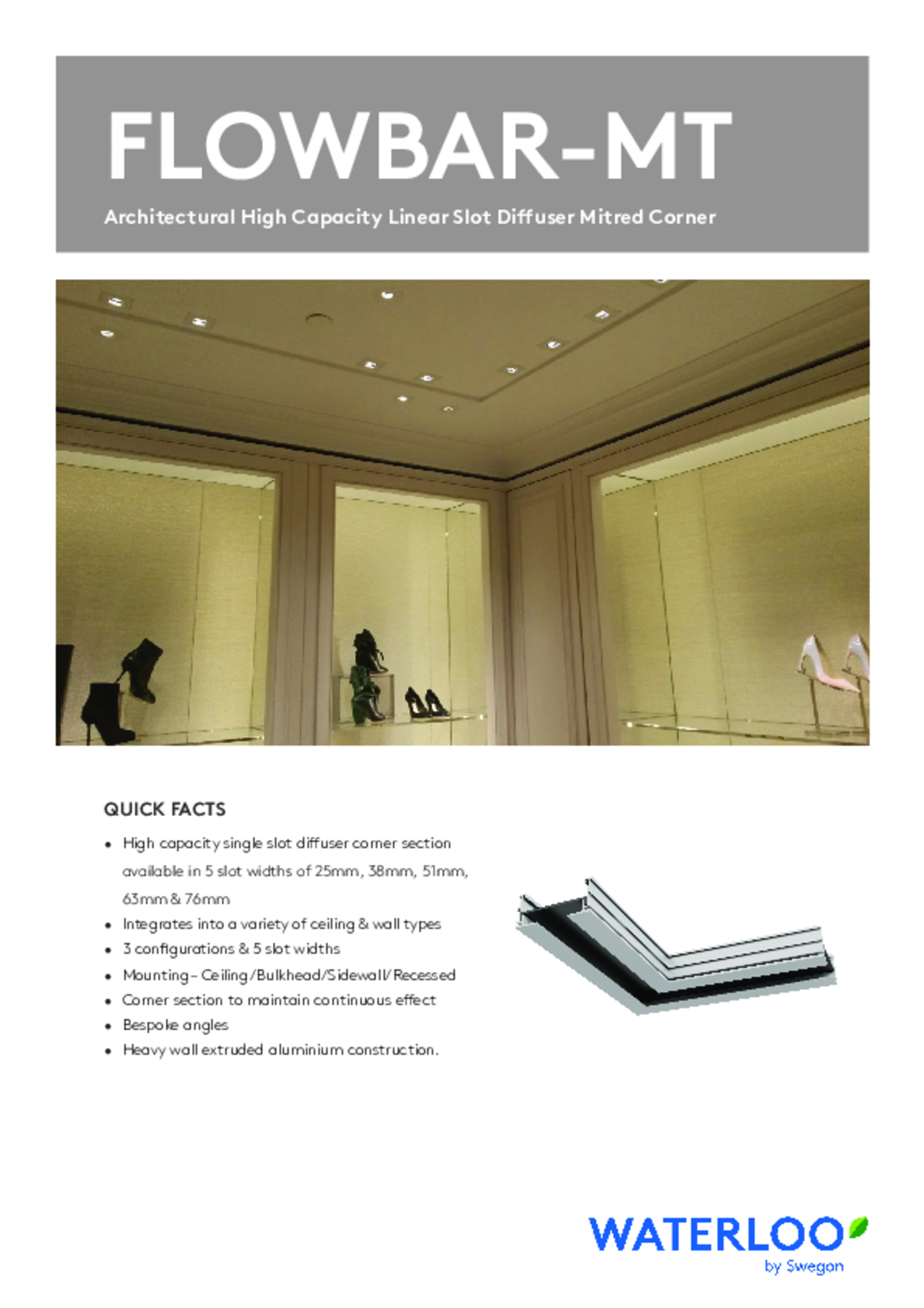 The FLOWBAR MT series is primarily designed for ceiling applications and allows the air diffuser to become inconspicuous, whilst fully integrating into the ceiling system. The FLOWBAR MT version is designed to seamlessly transition straight or curved FLOWBAR diffusers from one side to the next without breaking design flow.